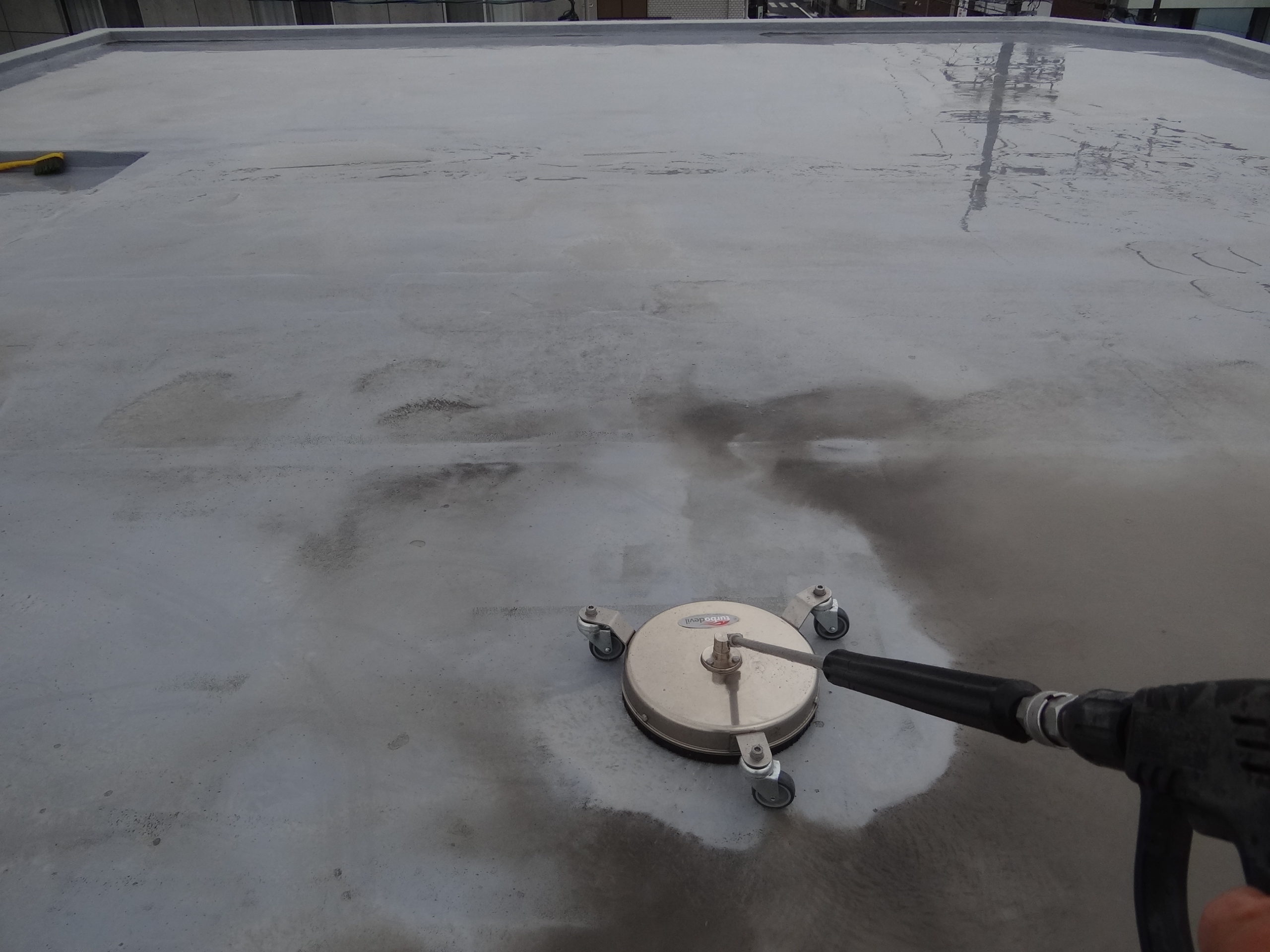 今日は天気予報通りの雨。少し先になりますが、屋上防水工事の高圧洗浄を先行して行いました。
