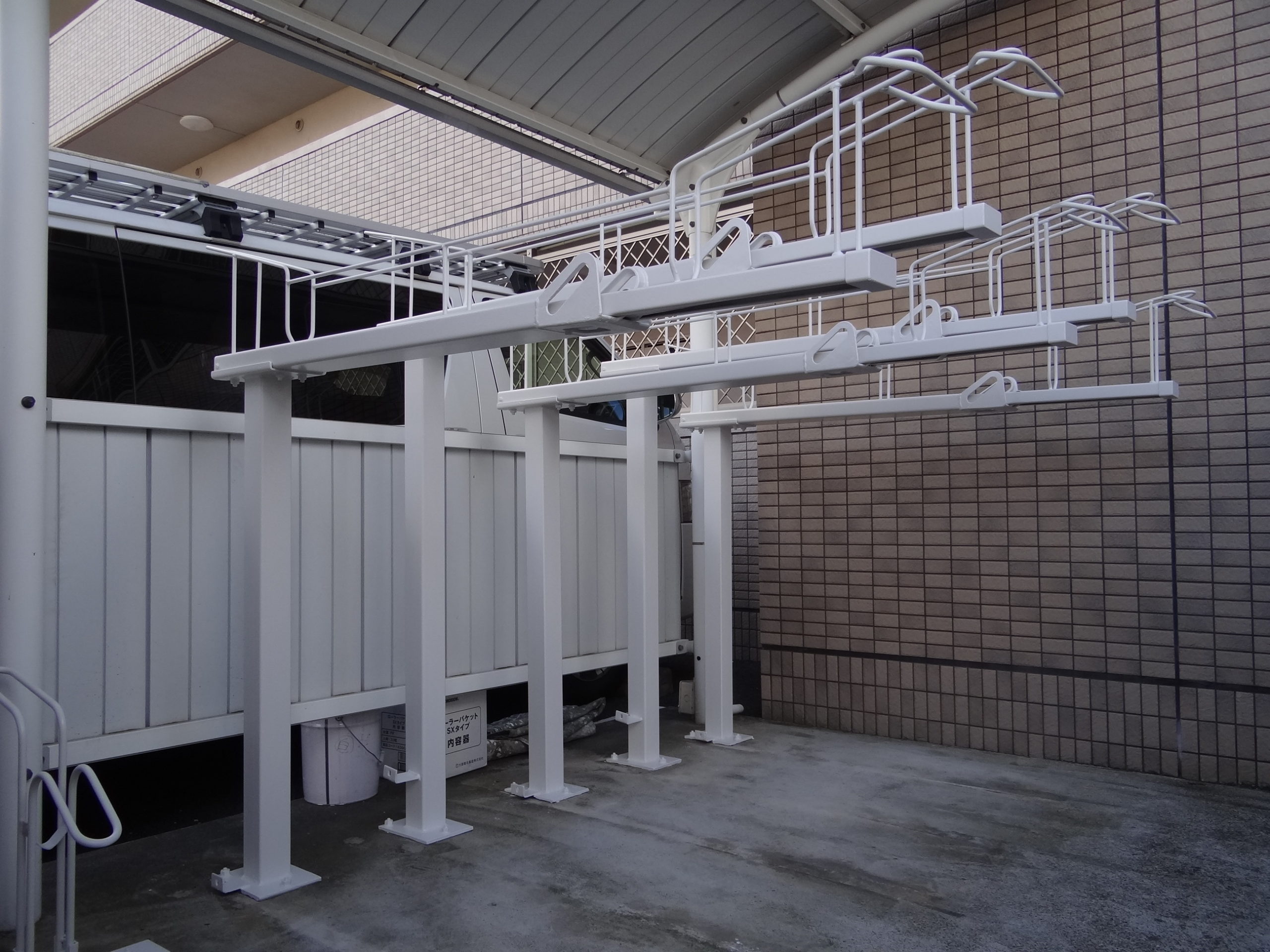 駐輪場の鉄部塗装は上塗りの1回目を塗布。