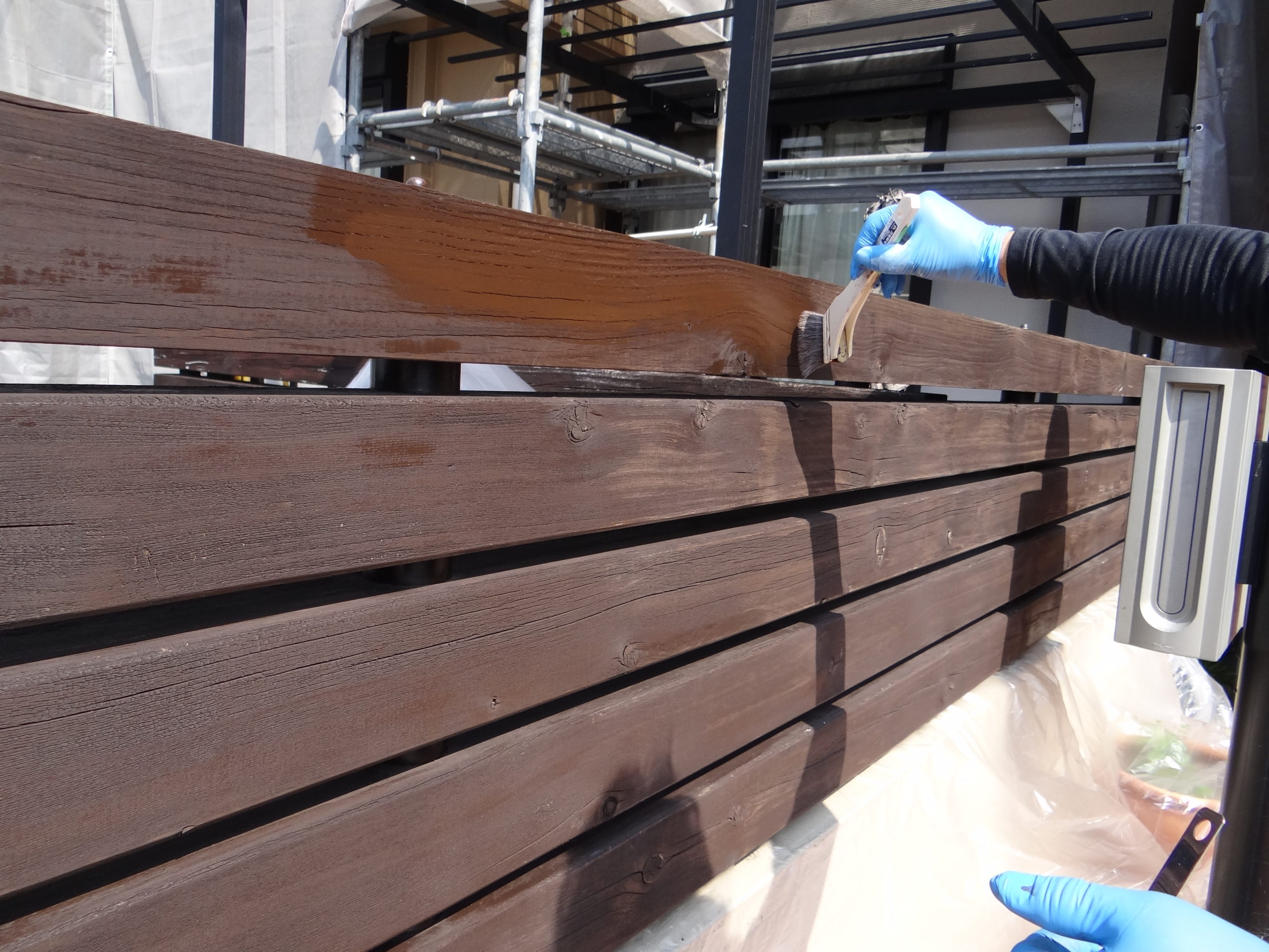 今日は木部塗装を行いました。使用材料はキシラデコールの色はパリサンダ。