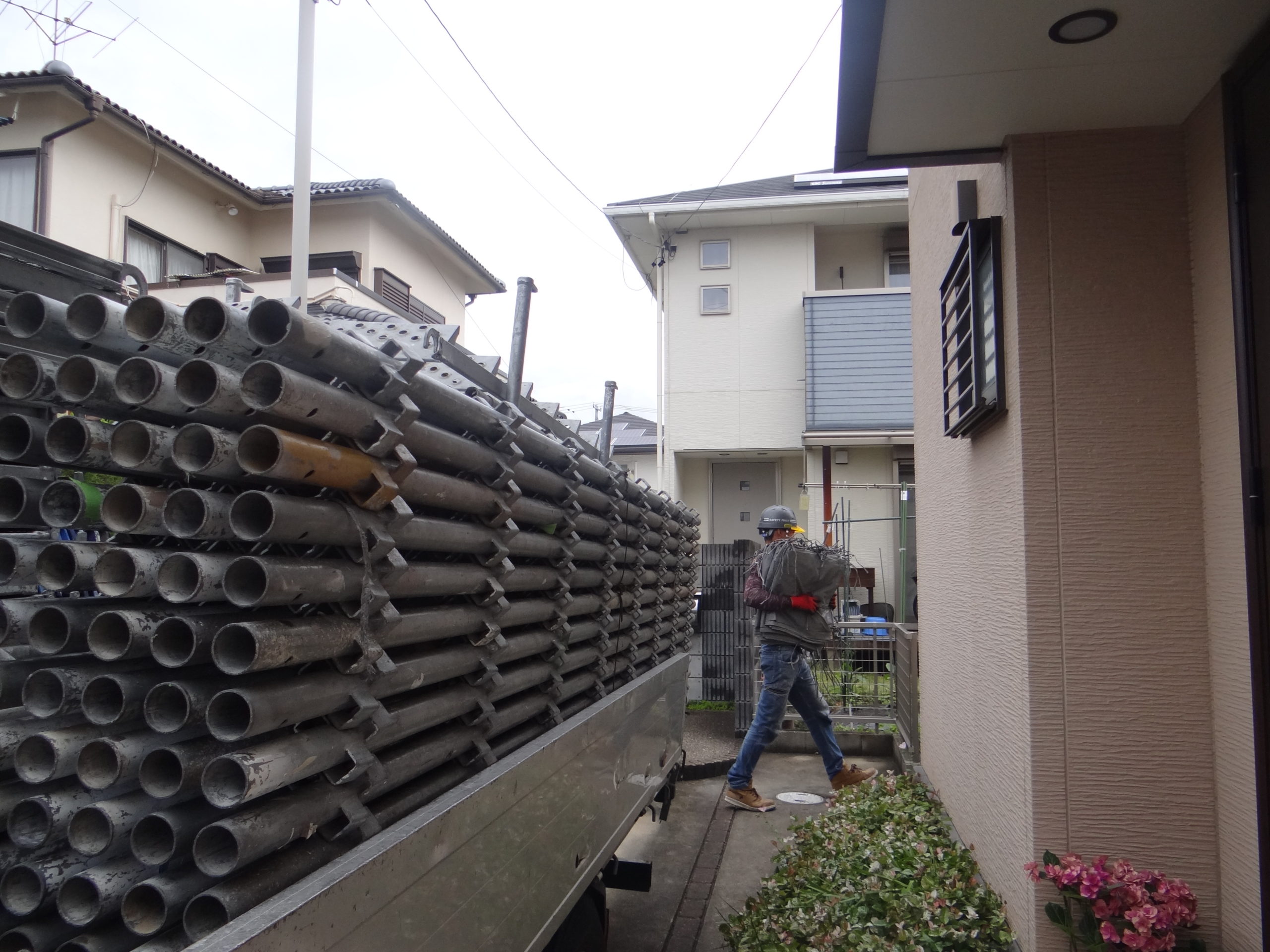 今日から住宅の塗装工事を始めました。まずは仮設足場の設営から行います。今回も安全第一に、しっかりとした外壁塗装・屋根塗装工事を進めます。