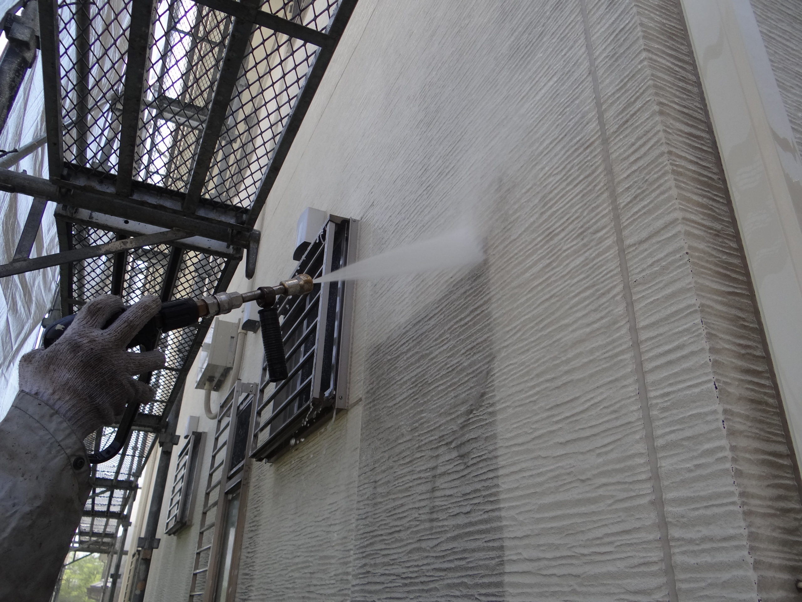 外壁の洗浄施工中。