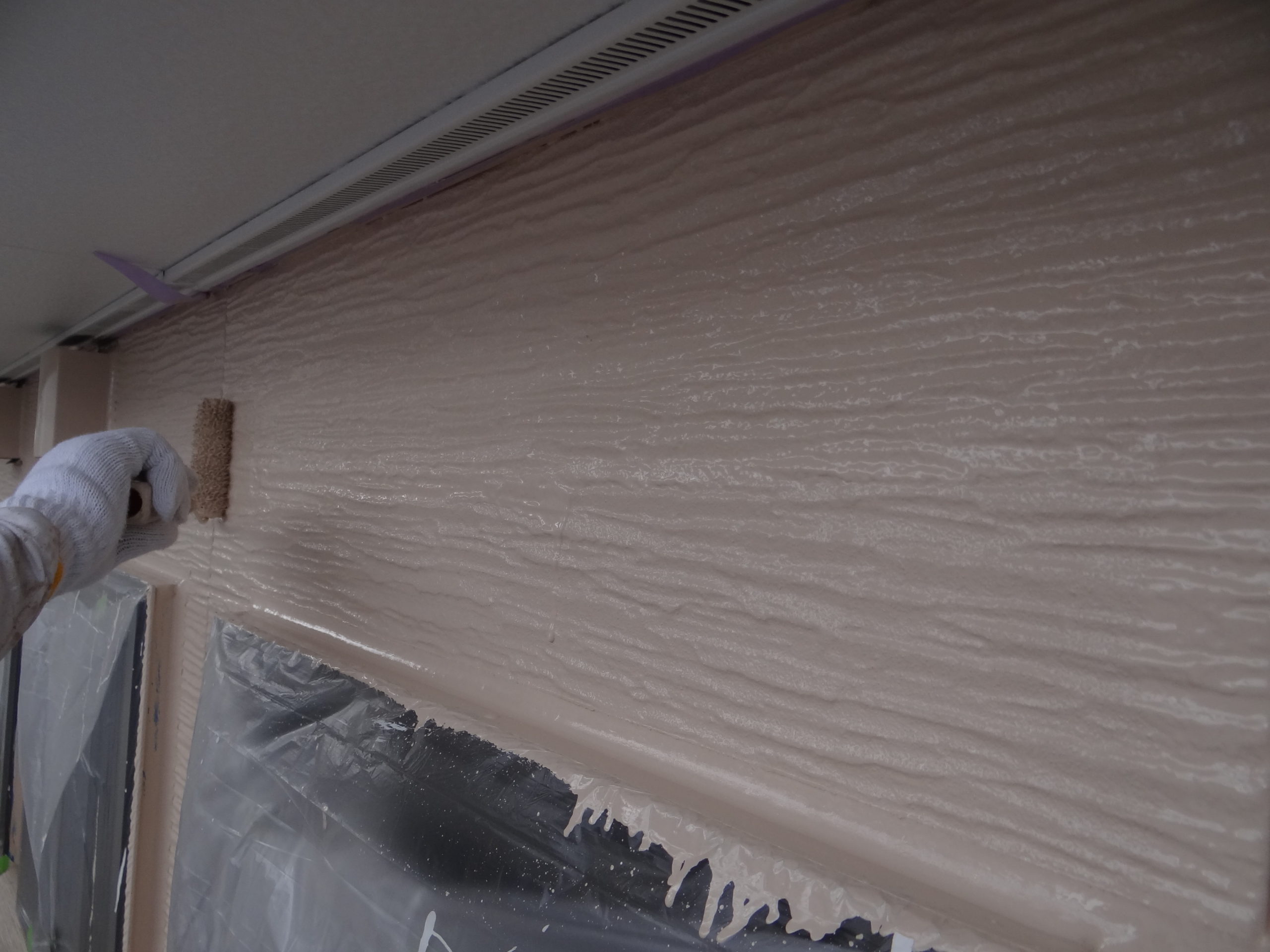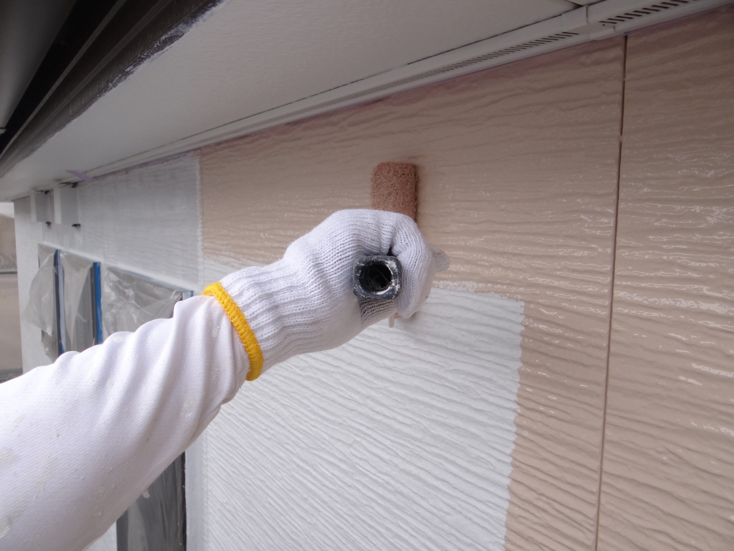 外壁塗装の使用材料です。今回もフッ素樹脂塗料になります。上塗りの1回目、塗布施工中。乾燥後、上塗りの2回目を行い仕上げます。夕方から雨予報でしたが、その前に完了です。雨は夜からかな?