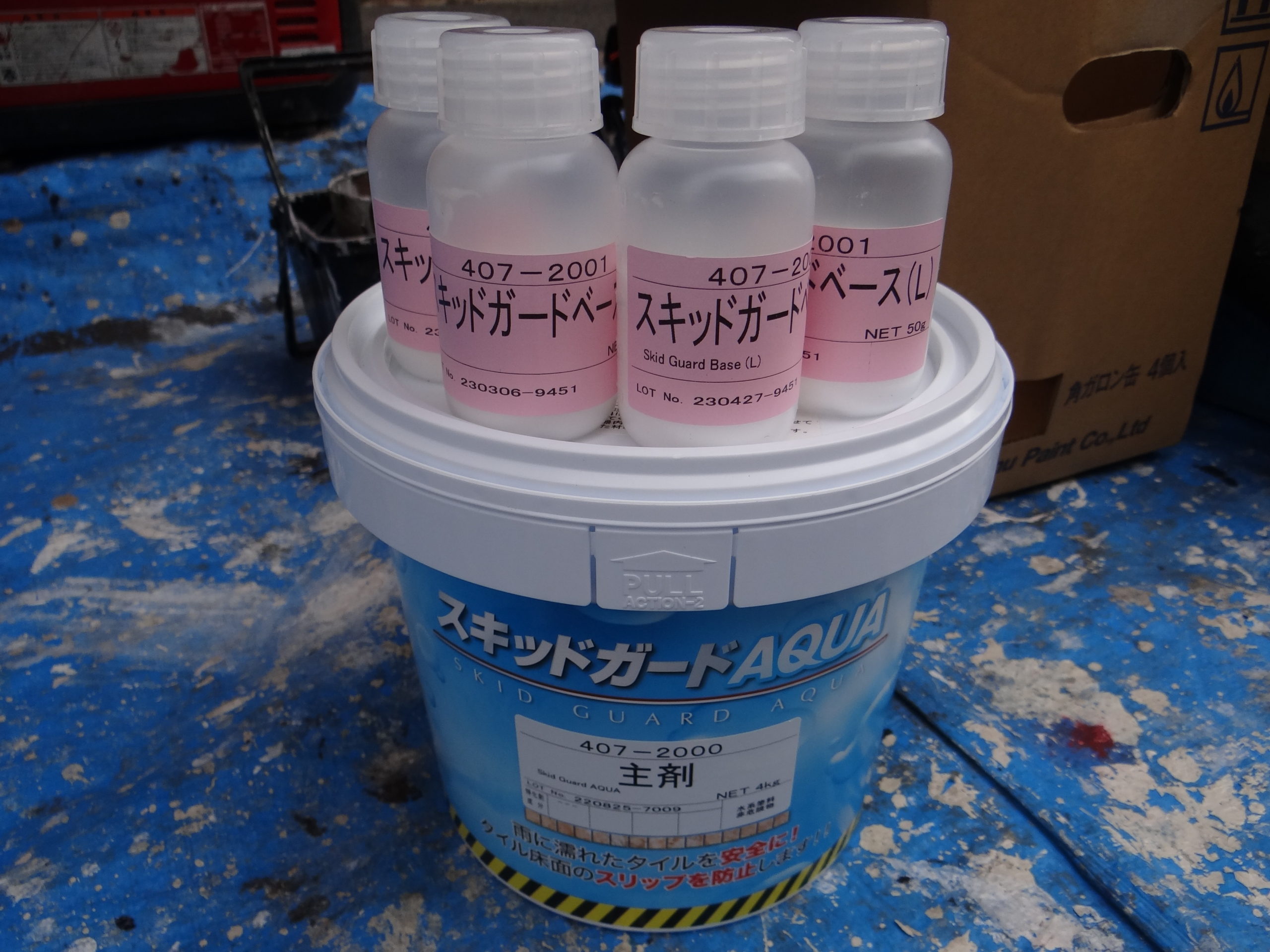 雨の日に濡れた床のタイルが滑って危ないので滑り止め対策を行いました。まずは清掃と脱脂。