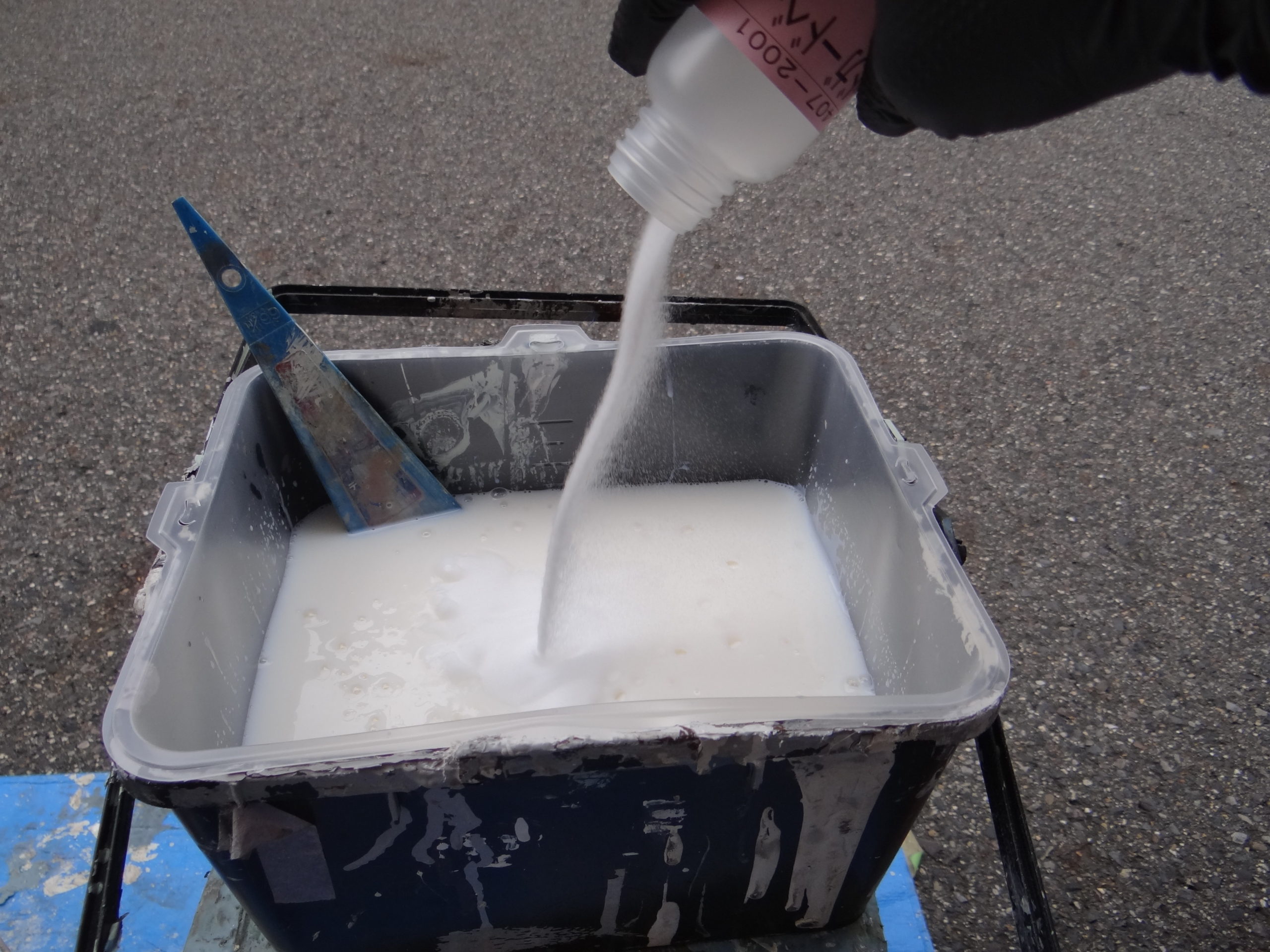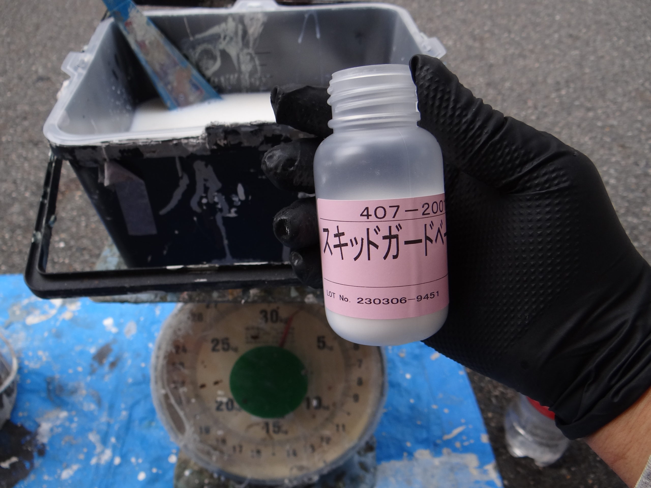 それを2回塗り重ねて完了。この季節は乾燥が早いのではかどります。床の骨材の状態を確認しながら施工を進めておりましたが、これでかなり滑り止めにはなりました。