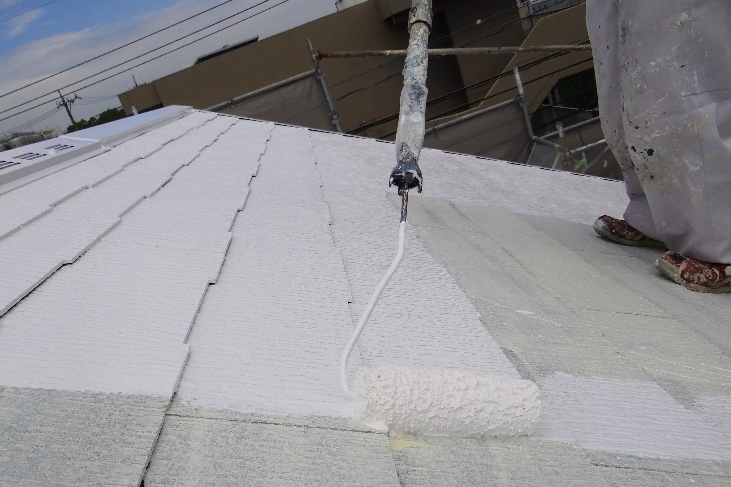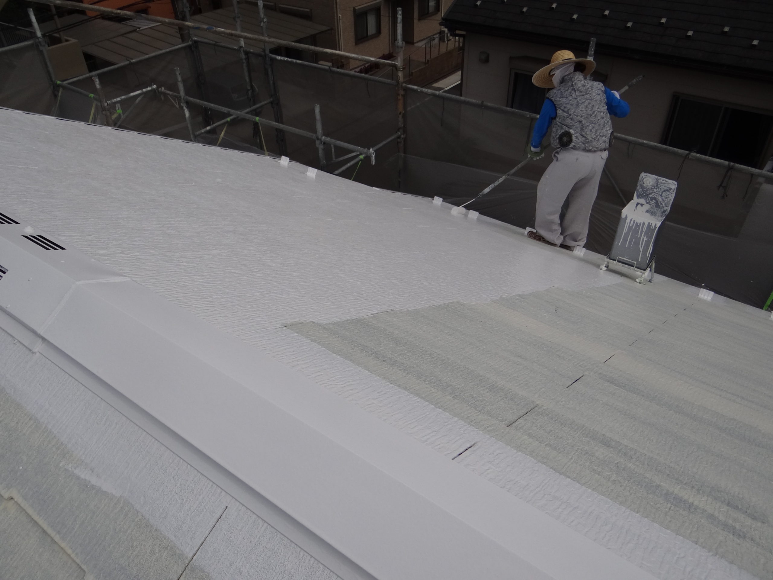 今日の屋根塗装は上塗りを行いました。使用材料の遮熱フッ素樹脂塗料のサーモアイ4F、色はクールホワイト。上塗りの1回目塗布施工中。上塗り1回目を塗り終えて今日はここまで。