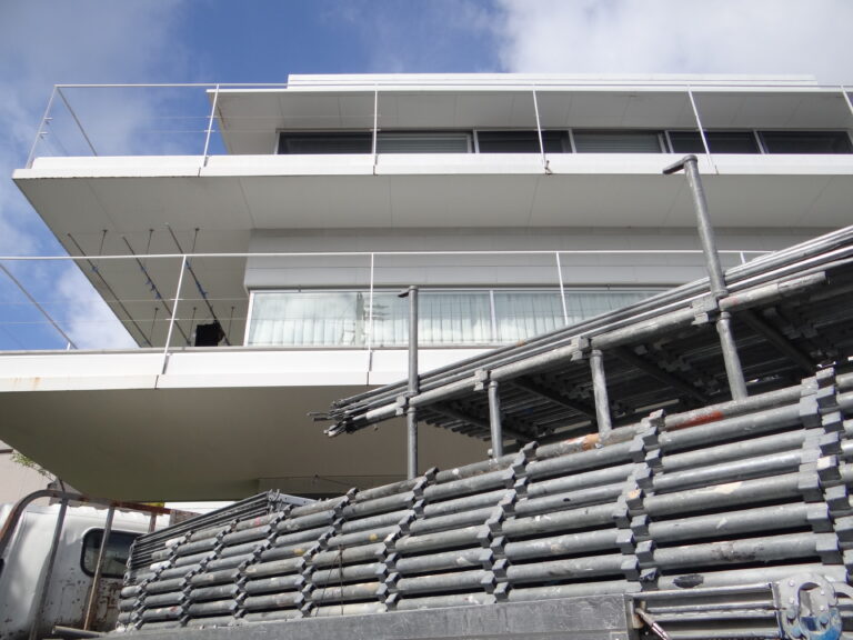 お盆休みも終わり、今日から住宅の塗装工事を始めました。まずは仮設足場の設営から進めます。今回の工事もいつものように、安全第一に施工を行います。