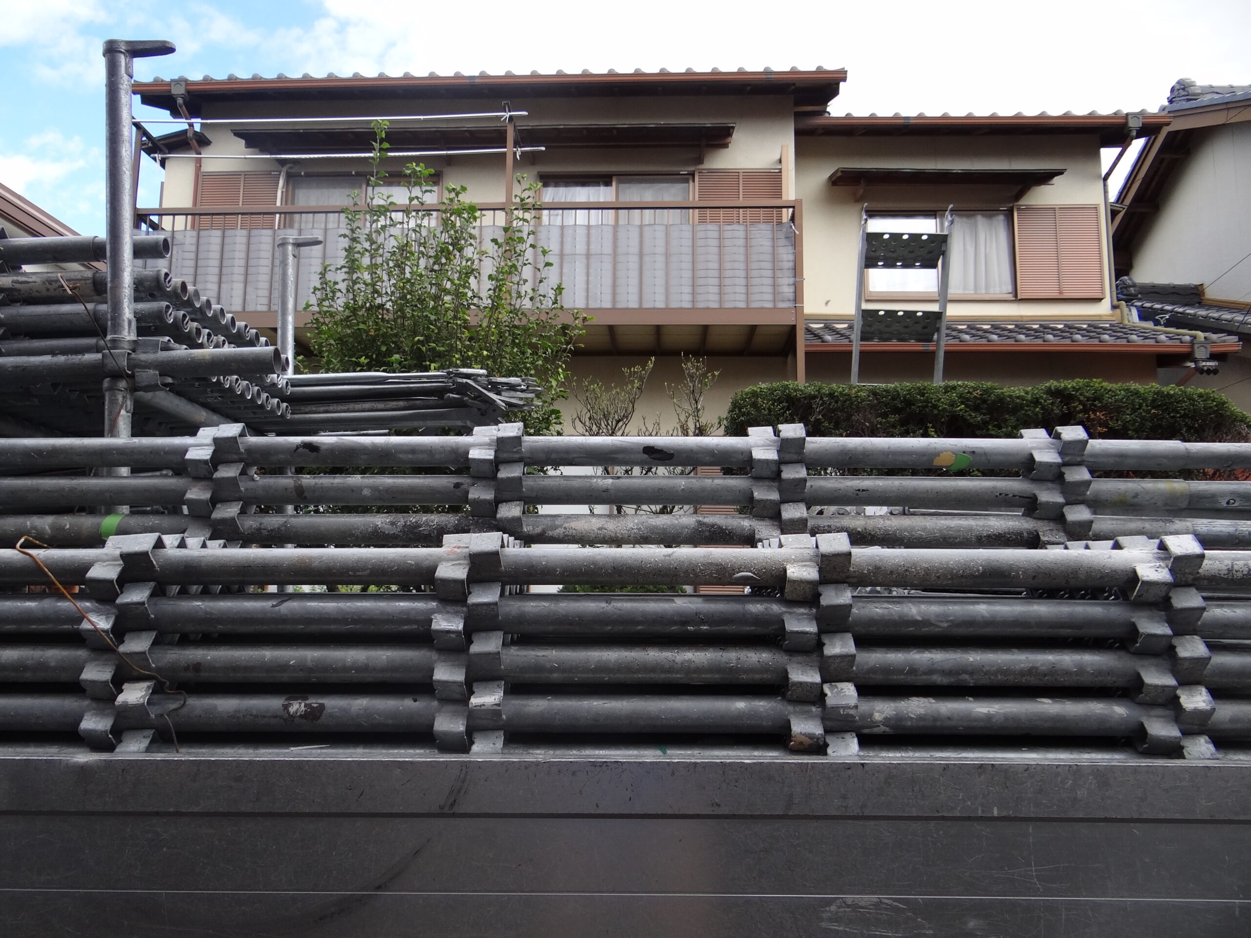 今日がら住宅の塗装工事の始まりです。まずは仮設足場の設営を安全第一に行います。