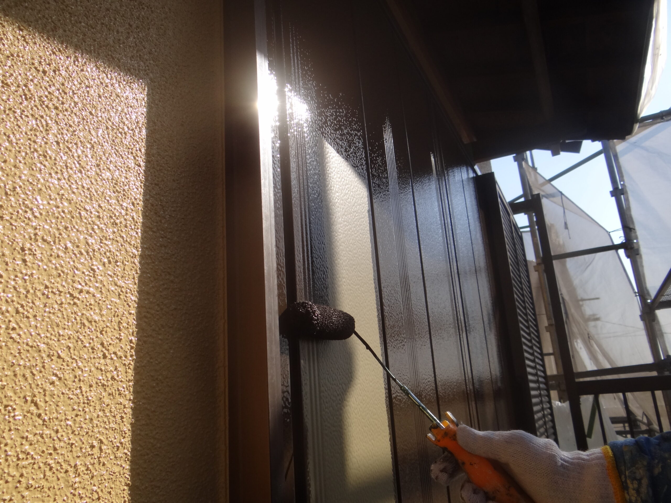 今日は雨戸などの塗装を行いました。今回の工事も天候に恵まれ順調に進めております。