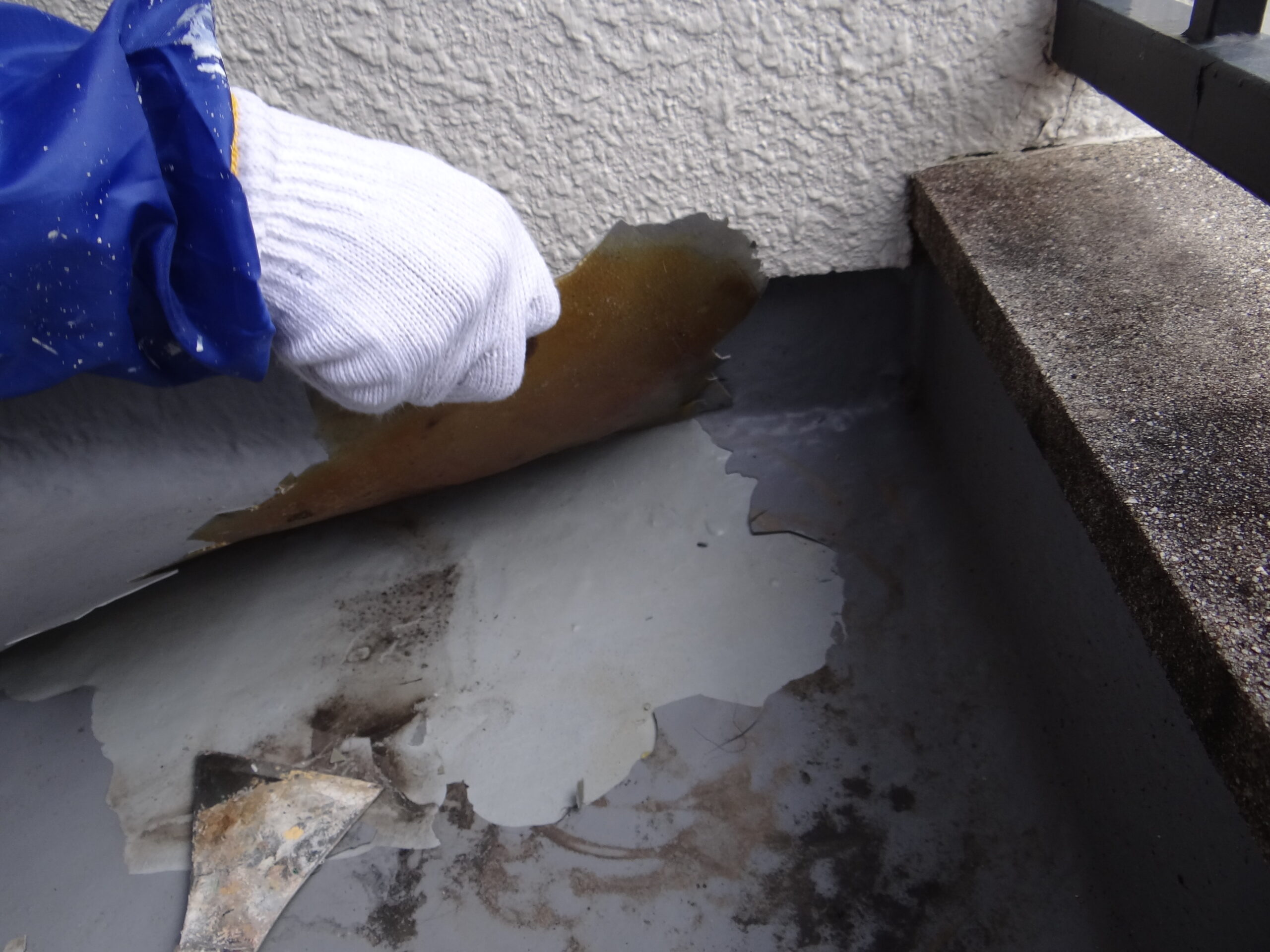 今日はベランダの防水です。不具合の箇所を撤去して、