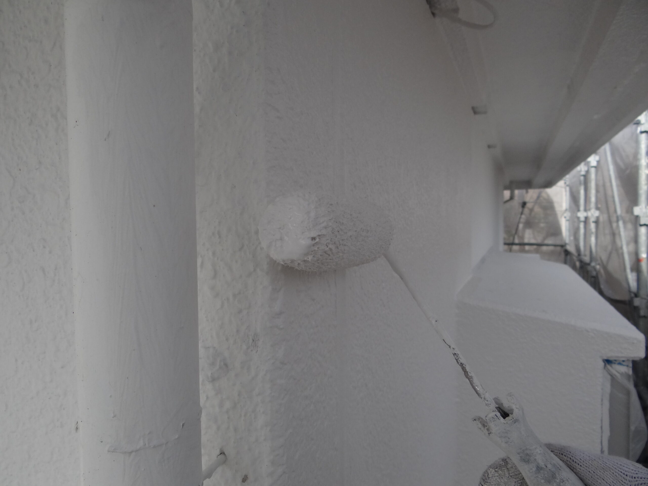 今日の外壁塗装工事は下塗りが完了したので上塗りの1回目を塗布です。風もなく暖かい日でした。