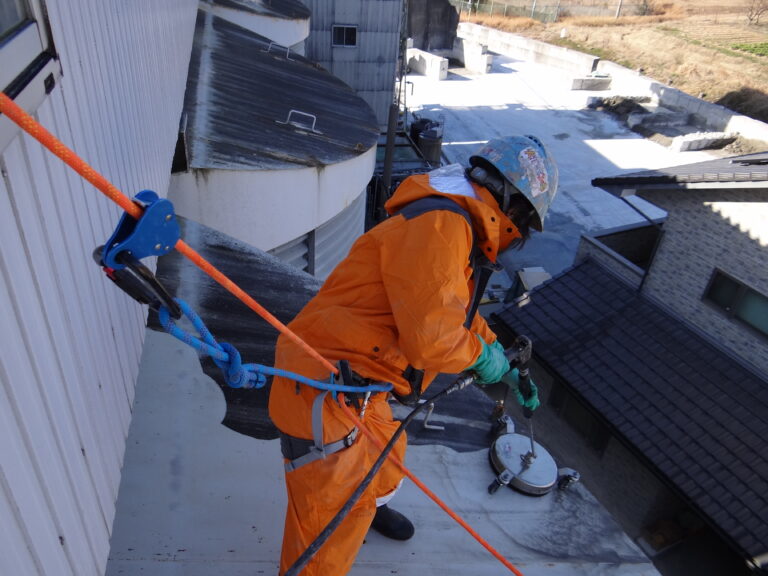 今日から高所での鉄部塗装工事のスタートです。まずは高圧洗浄から進めます。