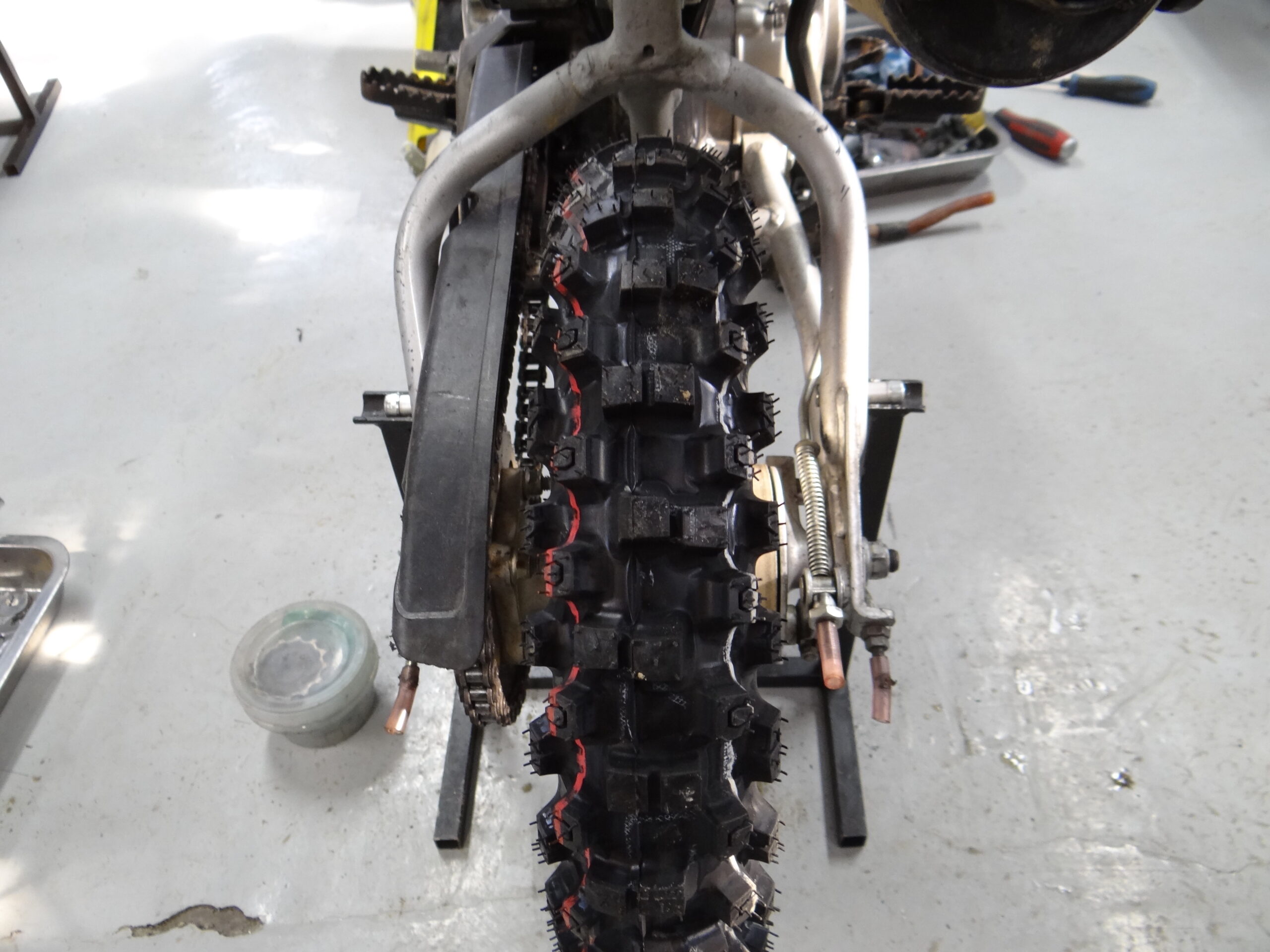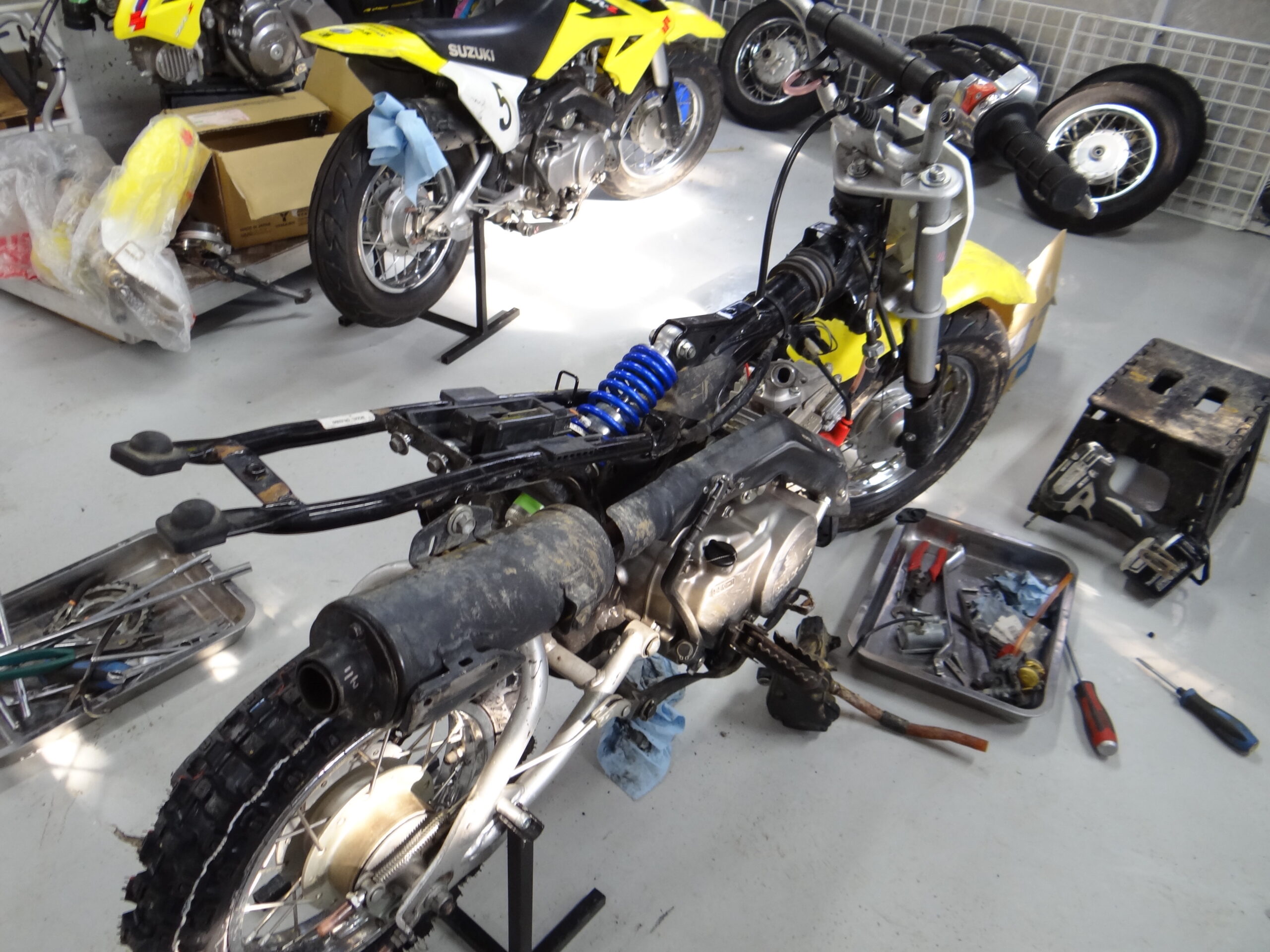 時間を作って息子達のバイク整備です。まずは最近がんばっている三男君の車両からチェック。そしてちょいと仕様変更。これで変化があるかな?