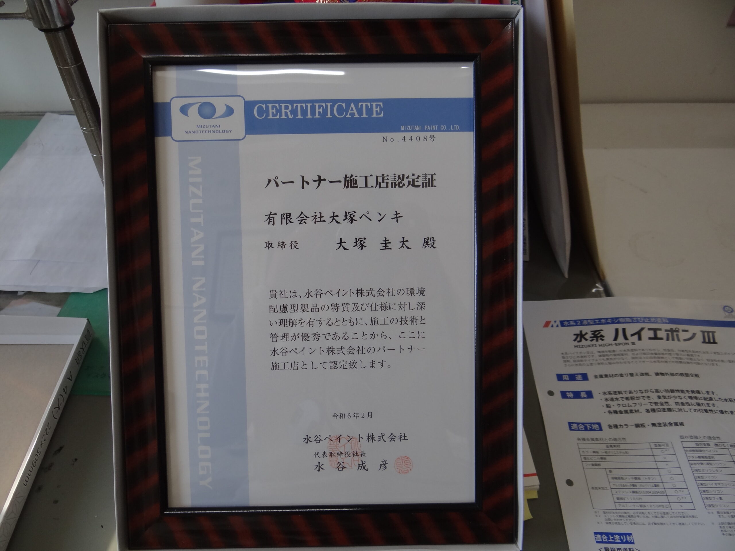 夕方、塗料メーカーの水谷ペイント株式会社様から、パートナー施工店の認定書を届けていただきました。ありがとうございました。