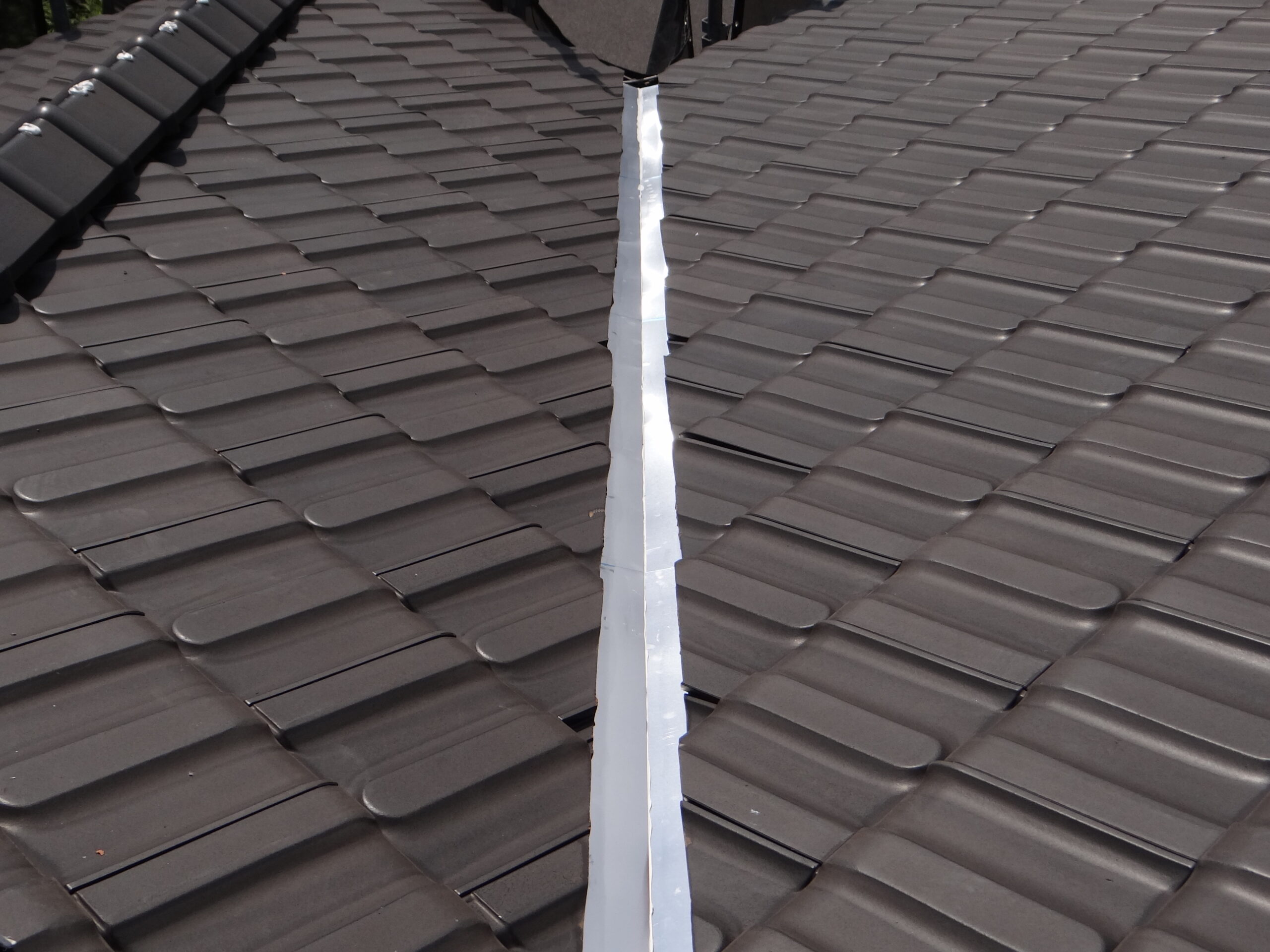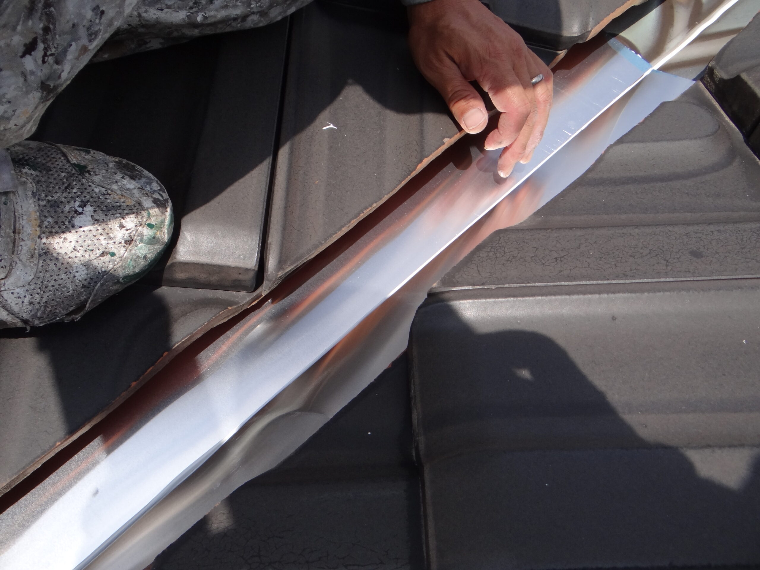 住宅の外壁塗装工事は、ほぼ完了してきたのでちょっと気になる箇所の補修をしています。谷樋の銅板がそろそろ穴が開きそうなので、ステンレスの平板を貼ります。これで雨漏りの心配はなくなりました。完了。