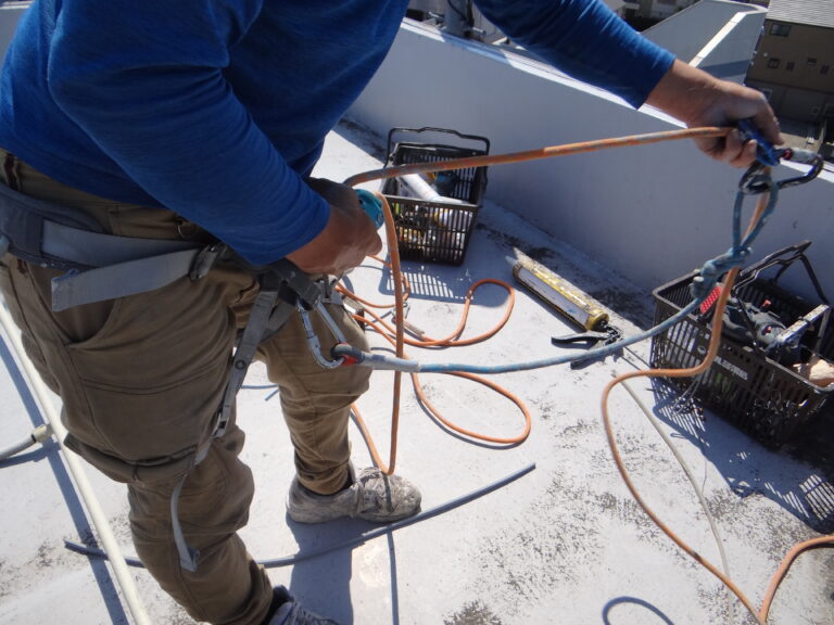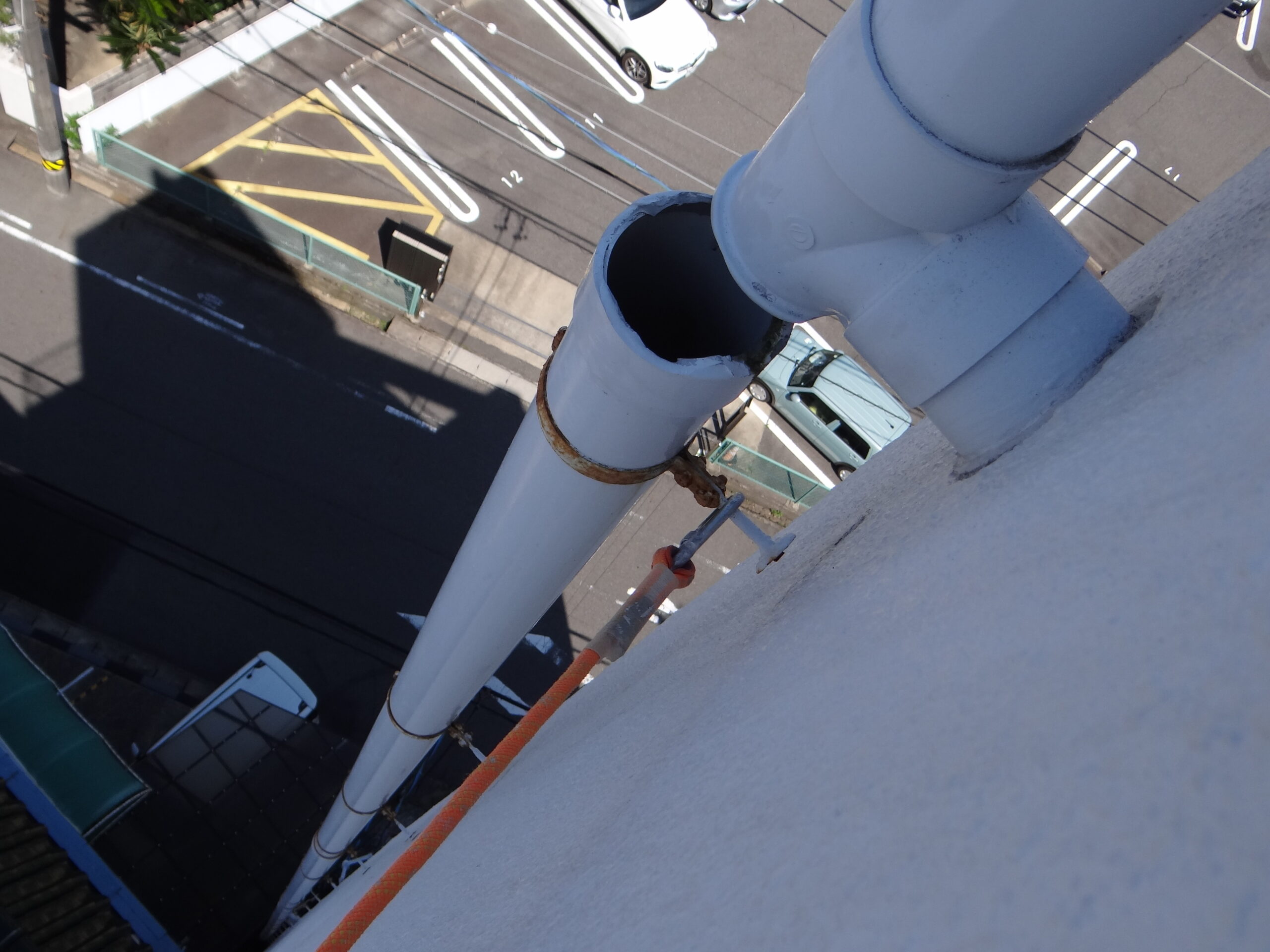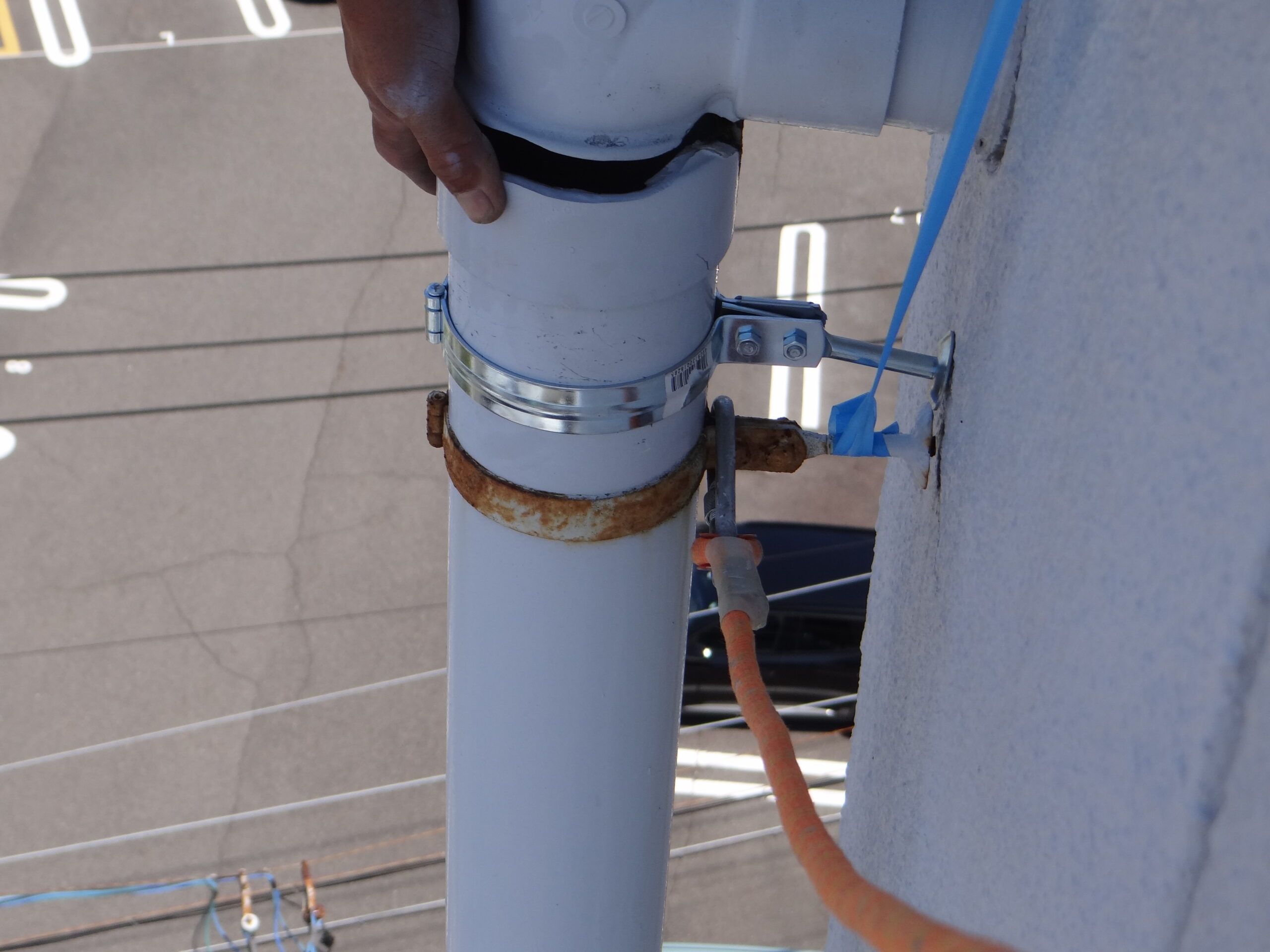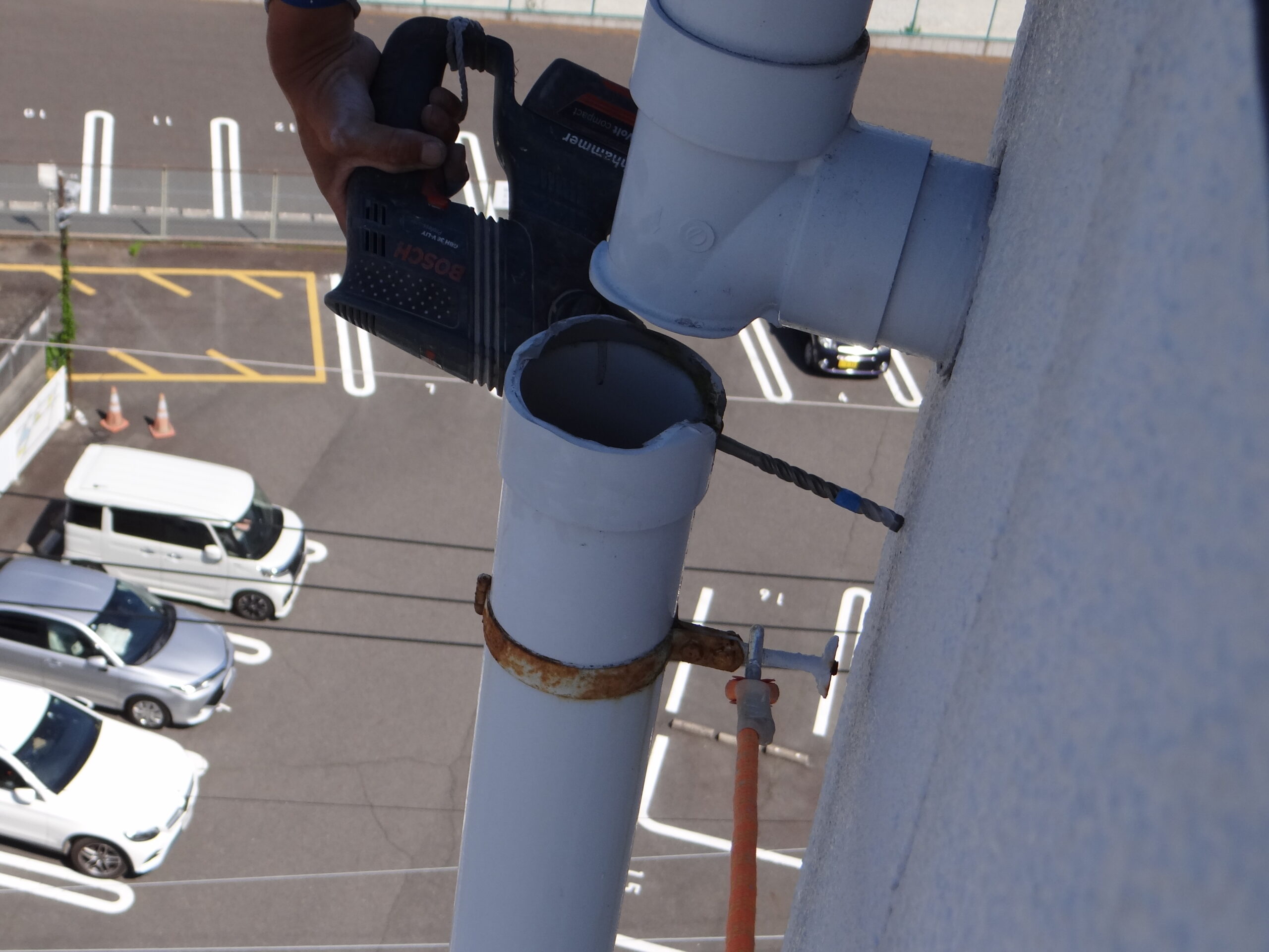 今日は高所での施工です。まずは安全対策をしっかりと。縦樋の取付金物が折れたので応急的に補修です。まーまー頑張って振動ドリルで穴開けてアンカーを打って、なーんとかバンドを取付固定しておりました。