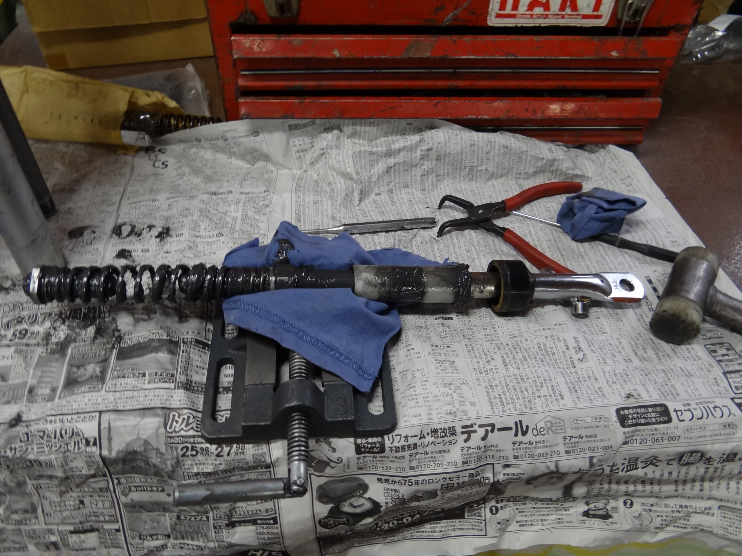 まーよく降る雨なので現場での施工は中止。溜まった事務仕事をせっせと進めます。座り仕事は腰が痛くなるので気分転換です。そんな昼休みは先週、次男が派手に転倒したのでフロントのチェックと部品交換。そんな雨の日。