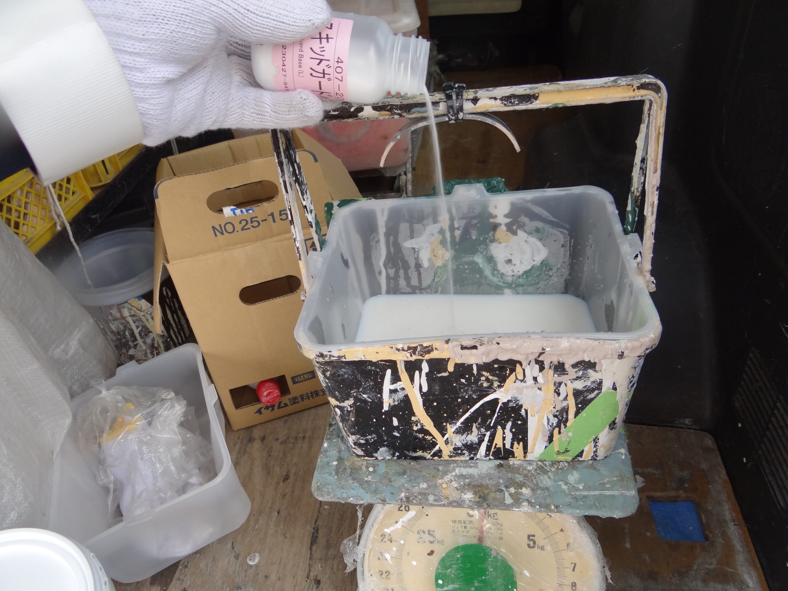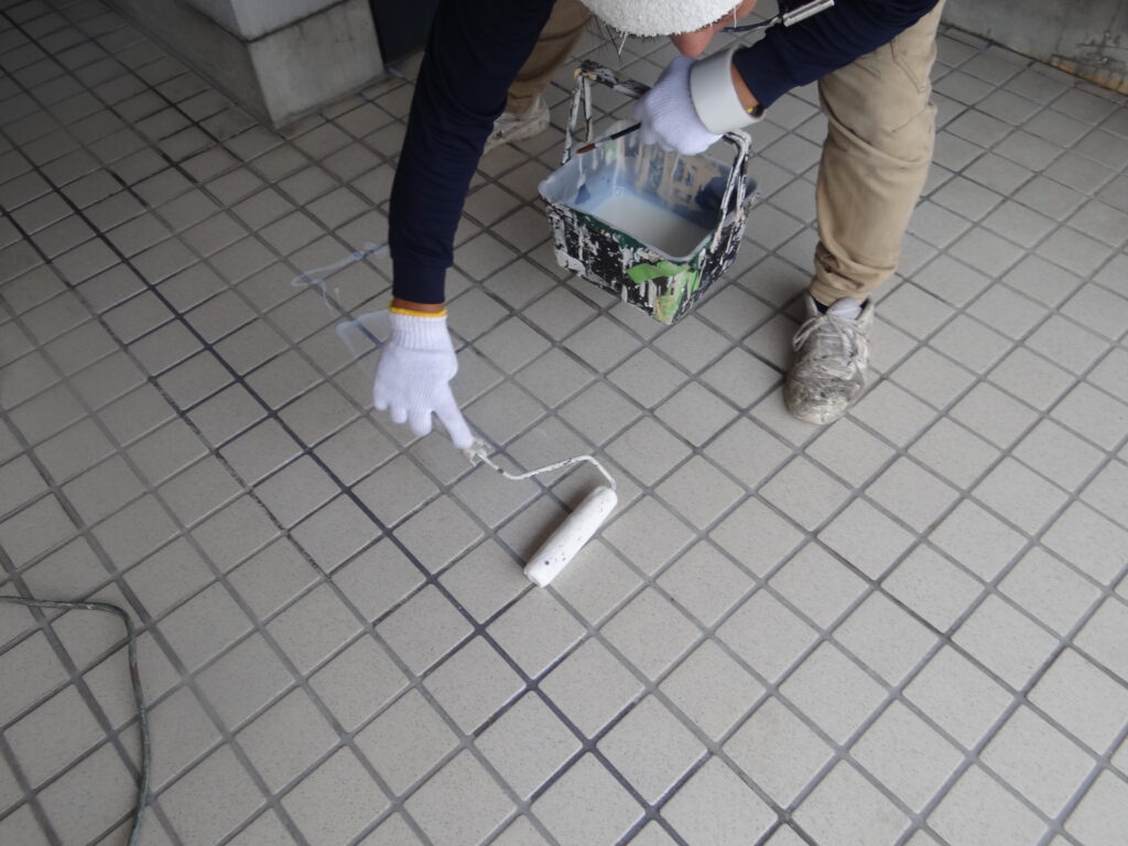 昨日、洗浄を行ったマンションの廊下で施工です。ここは雨の日に滑りやすいので、その対策です。今回はスキッドガードAQUAを塗ります。骨材を入れてノンスリップにいたします。
