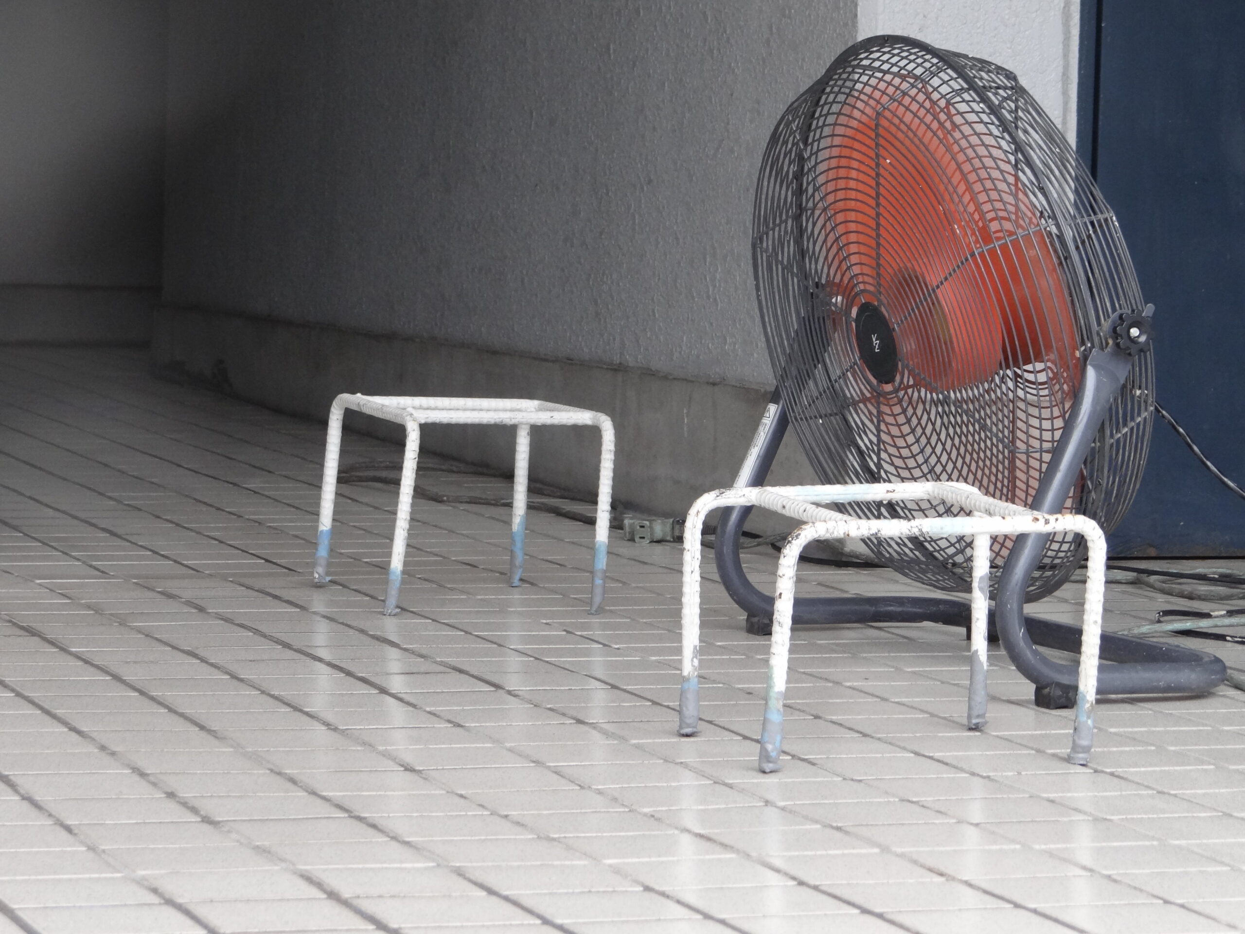 比較的、乾燥の早い材料ですが扇風機を使って乾燥を早めます。入居者さんが歩かれるのでかなり気を使って施工を進めます。