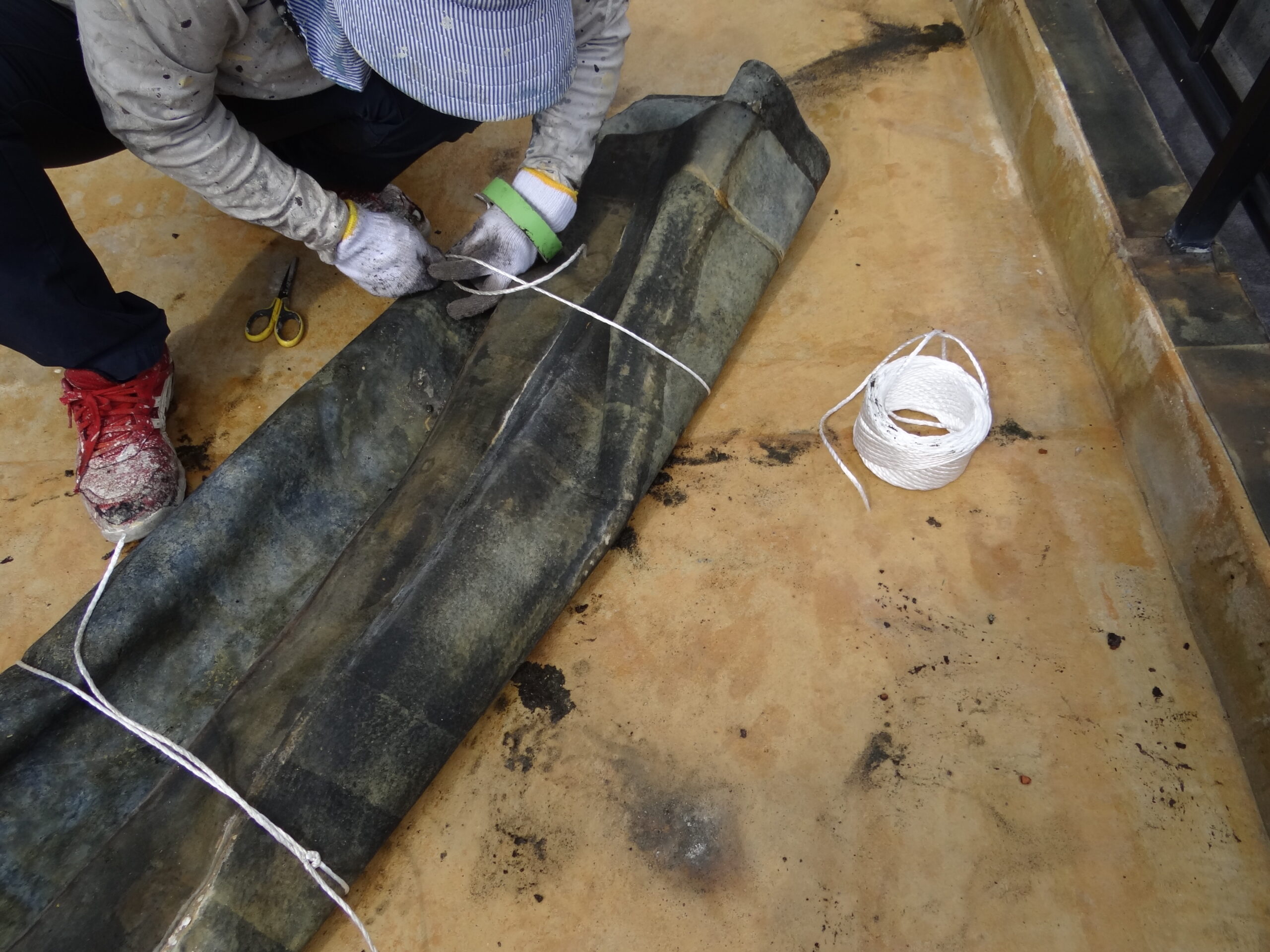 バルコニーの防水工事を始めました。まずは既存防水シートを撤去です。