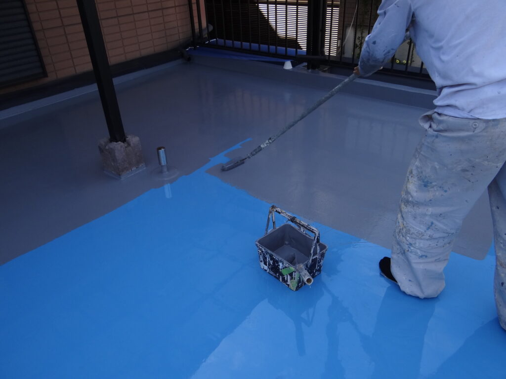 今日はバルコニーの防水工事の仕上げでトップコート。