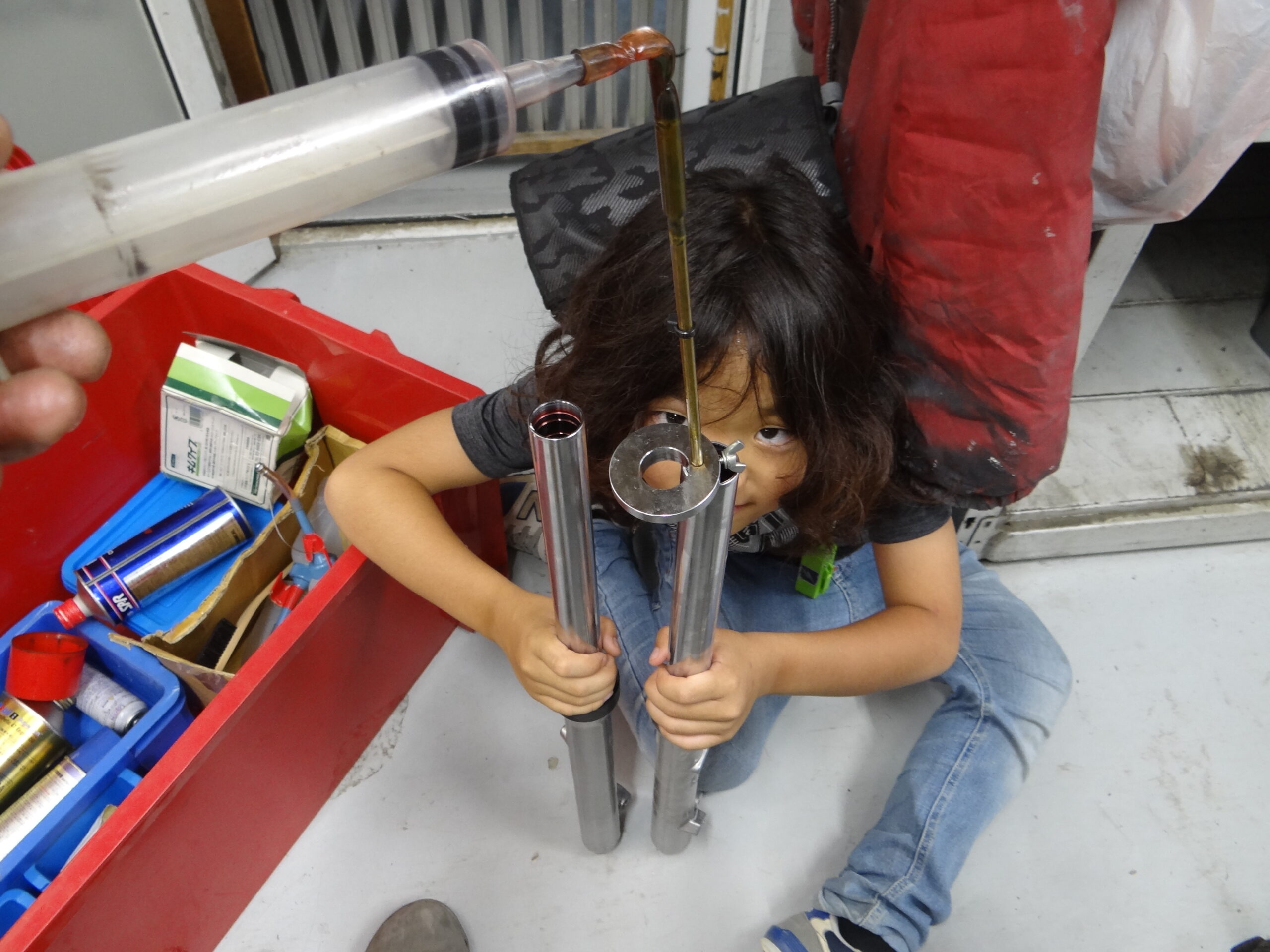 チビ達のバイクの整備はステムのグリスアップ。ステムの動きは、まーまーいい感じ。