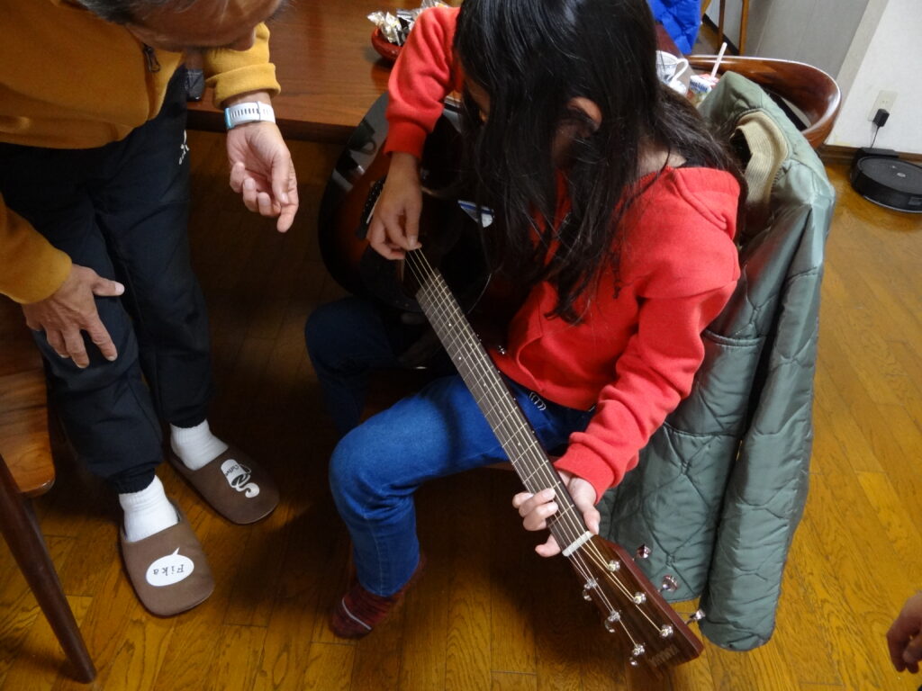 その後はお祖母ちゃんの家で叔父さんにギターを教えてもらって、みんなニコニコな日です。今年は大変お世話になりました。また来年もよろしくお願い致します。