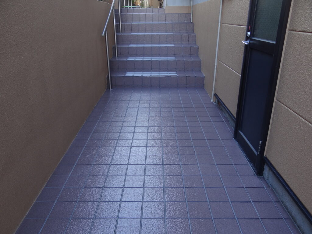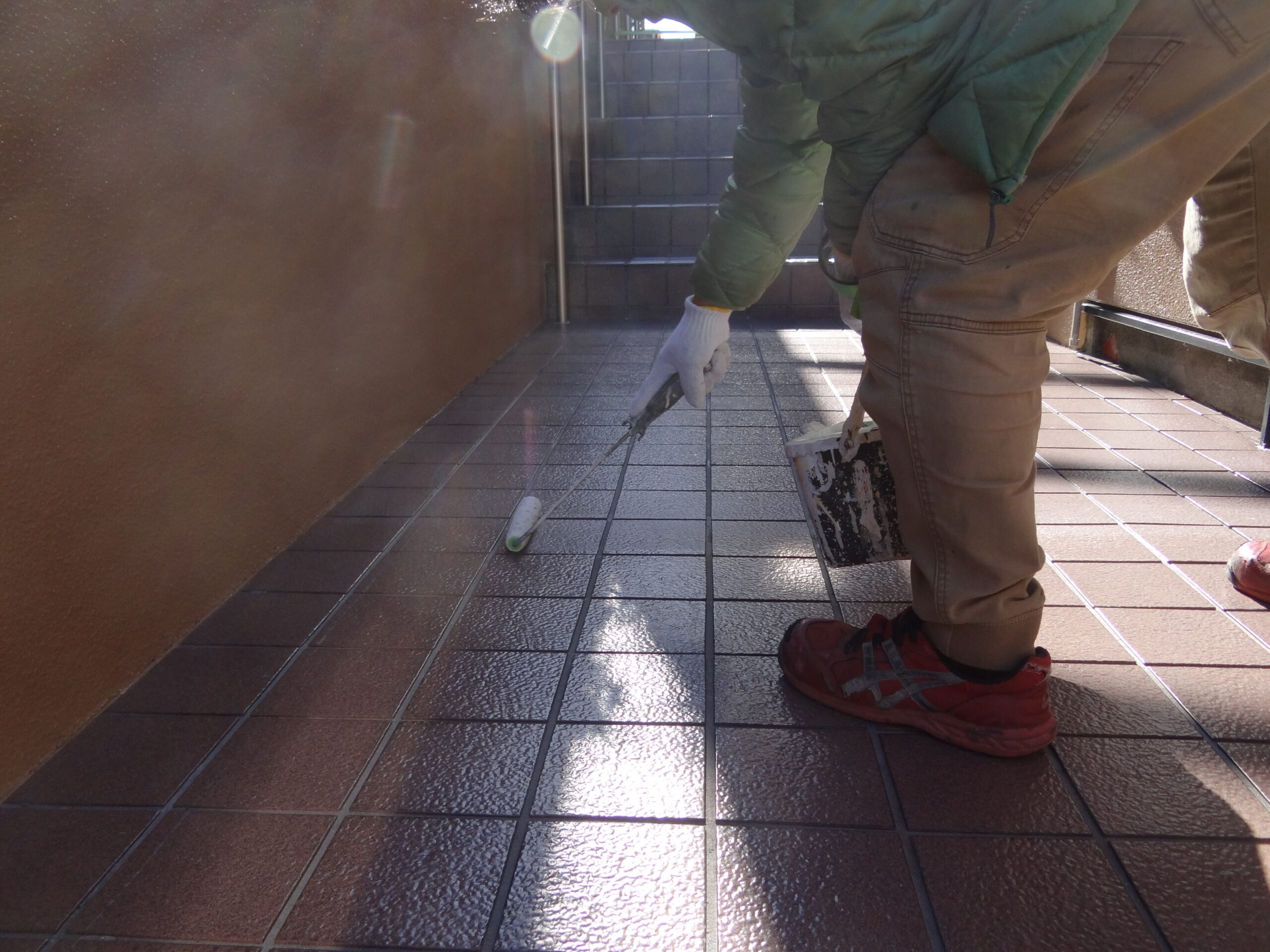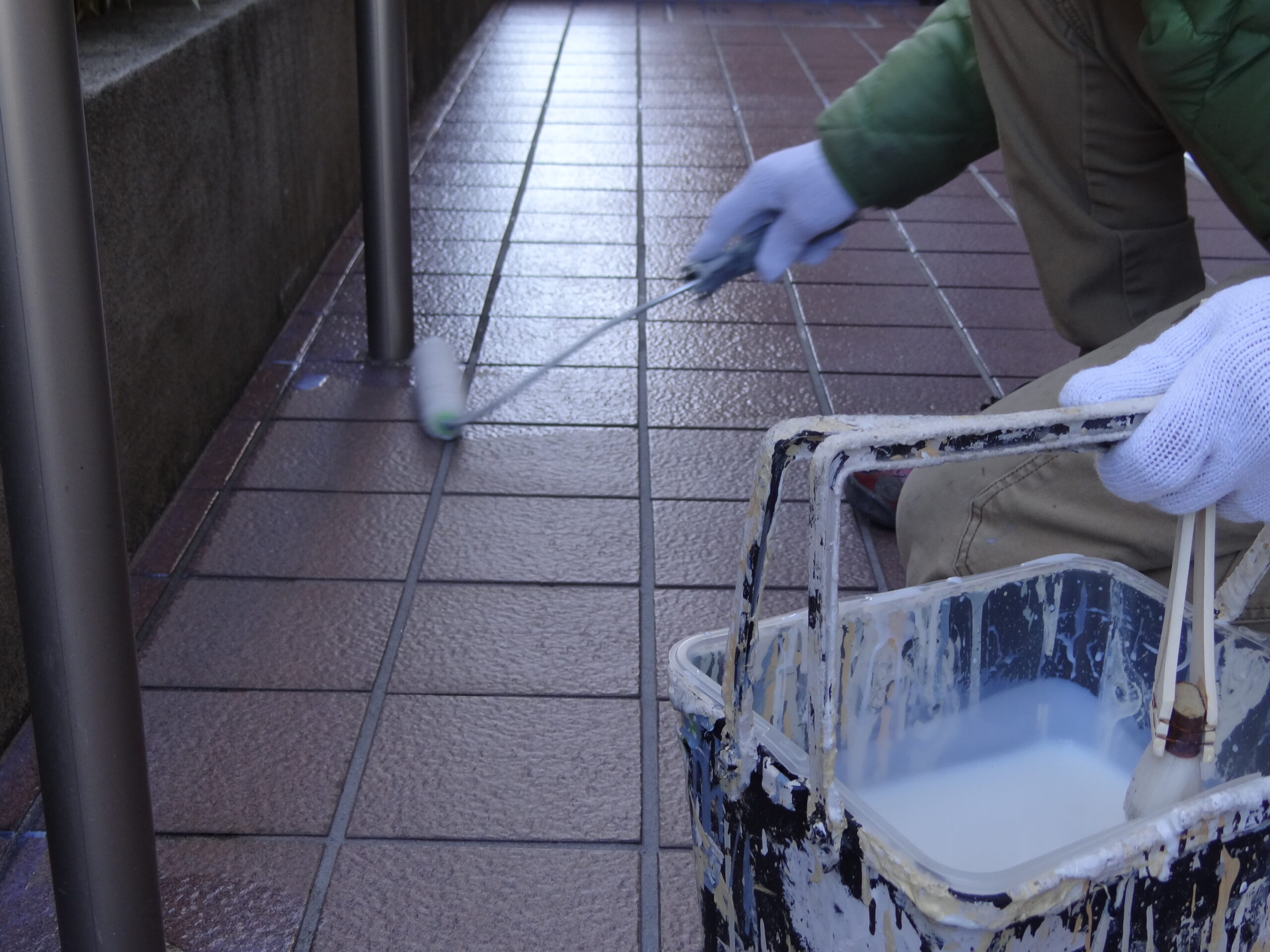 少し前に土間のタイル洗浄をすませたので今日は滑り止めの塗装を行います。
