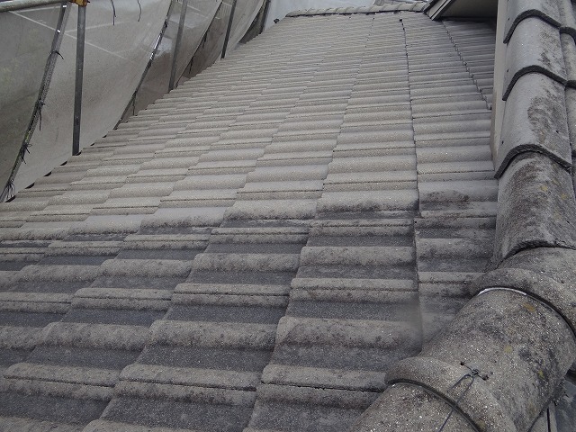 今日の名古屋は雨です。でも高圧洗浄日和なので、とてもはかどります。まずはモニエル瓦の洗浄。