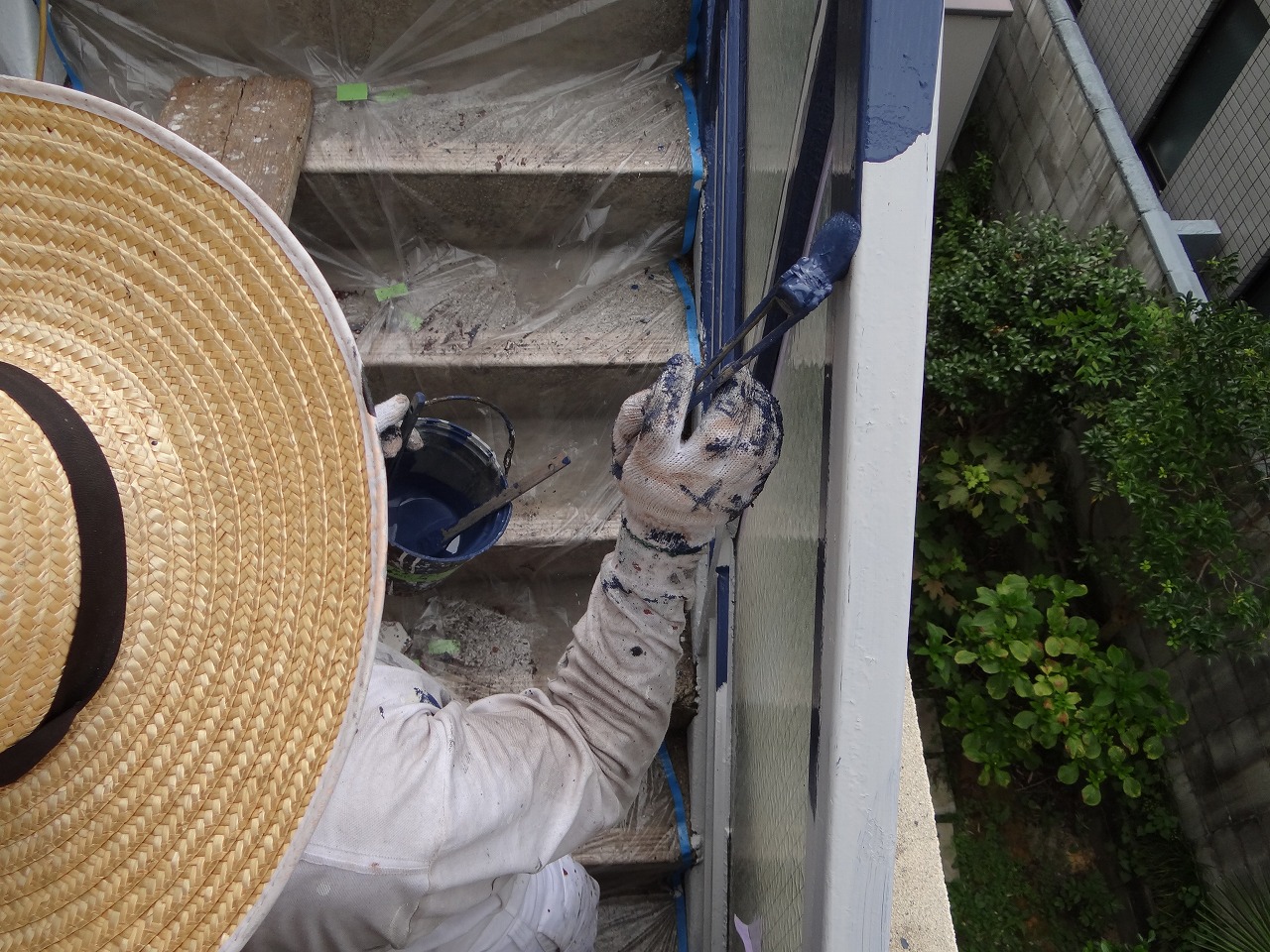 今日は手摺などの鉄部塗装工事を行いました。まずは旧塗膜やサビを削るケレン作業から、