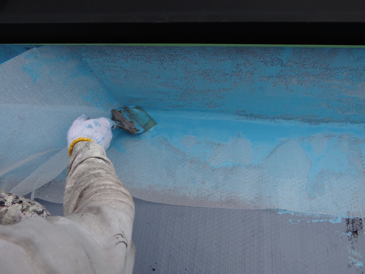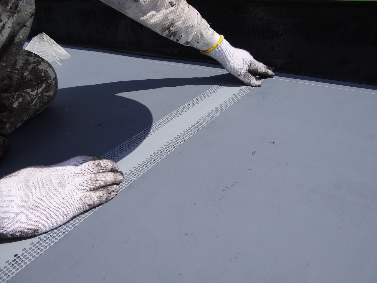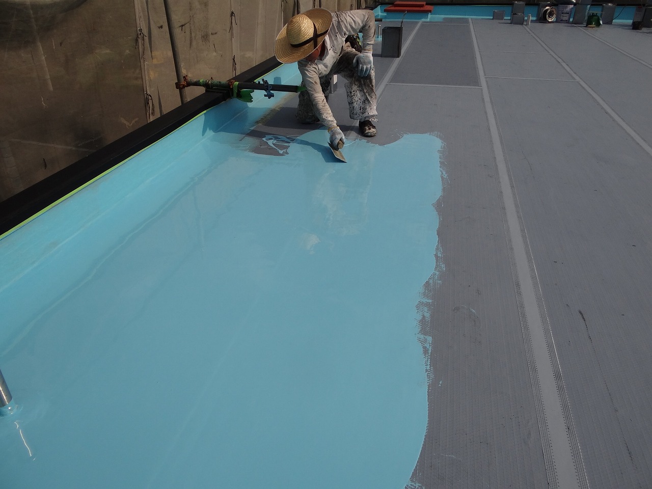 今日は防水工事を進めておりました。通気緩衝シートを貼って、テープを貼って、脱気筒を設置して、立ち上がりにクロスを貼って、ウレタンを流して、今日はここまで。暑い日でしたので焦げました。