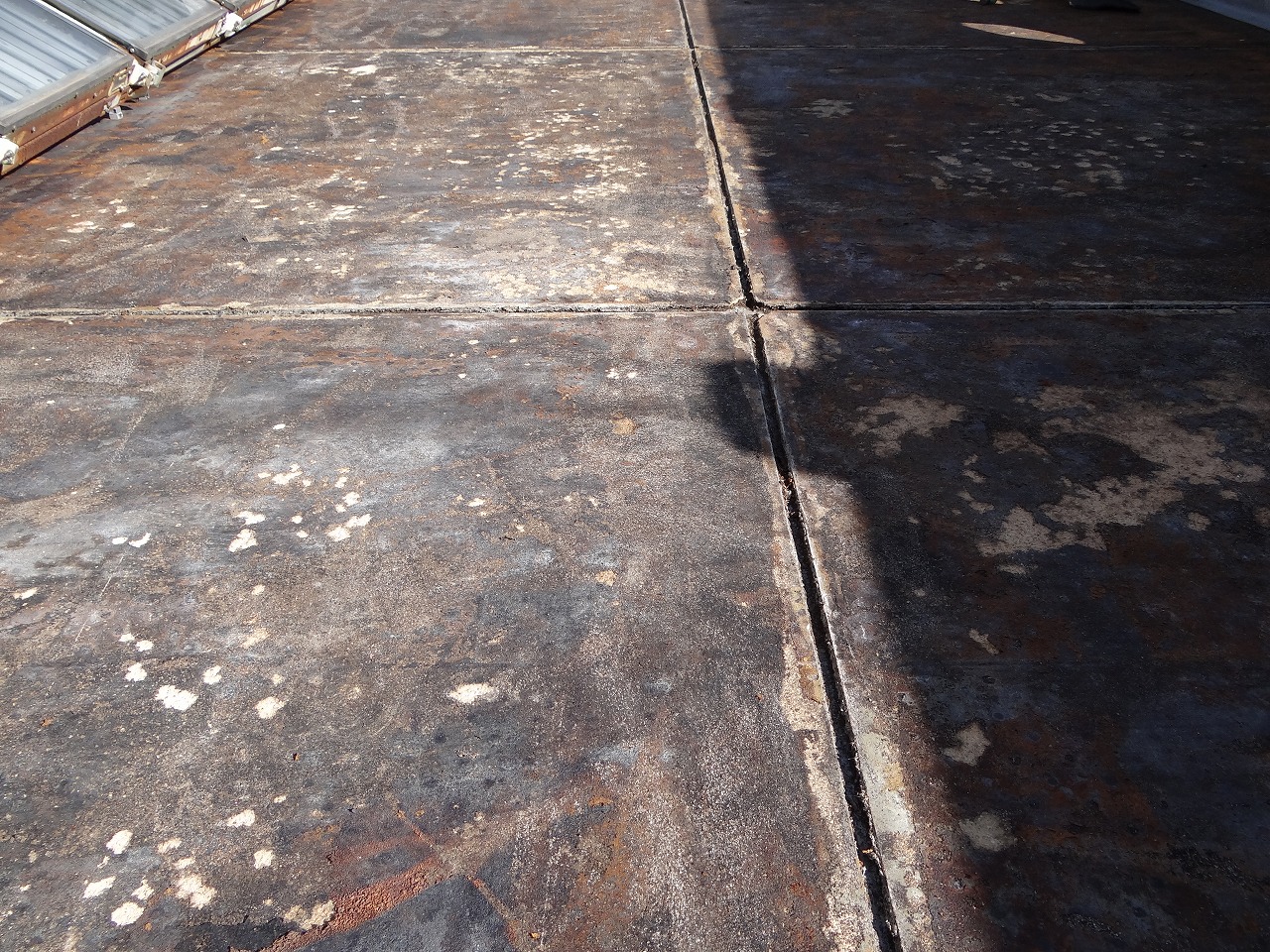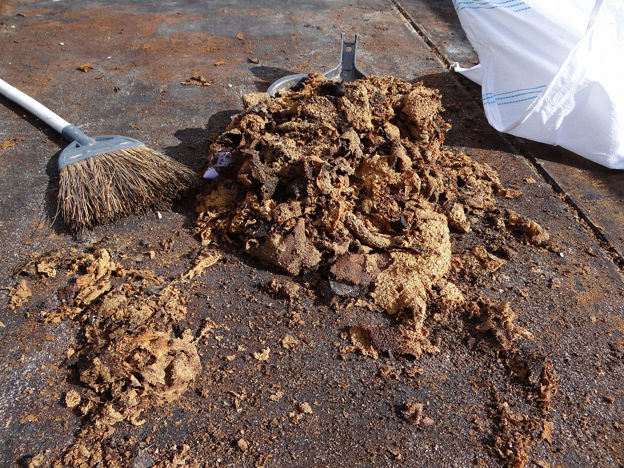 今日は防水工事を進めておりました。まずは旧防水層の撤去を行いました。通気緩衝シートにしっかりと雨水を含んでおりました。