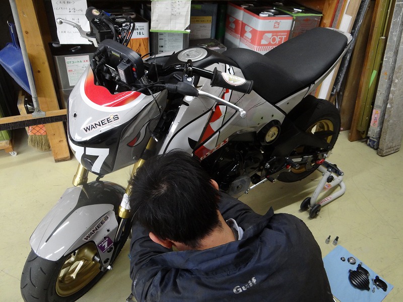 今日は玄関の扉や枠などの塗装工事を進めておりました。壁もコロコロ~と塗ってキレイになります。そんな塗装工事を終わらせて、さぁ、やりましょう~グロムの整備の開始です。