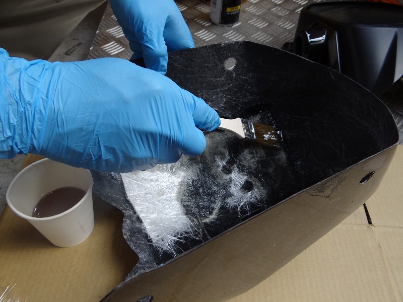 今朝はちょっと早起きして破損したグロムのフロントゼッケンカウルの補修を行いました。