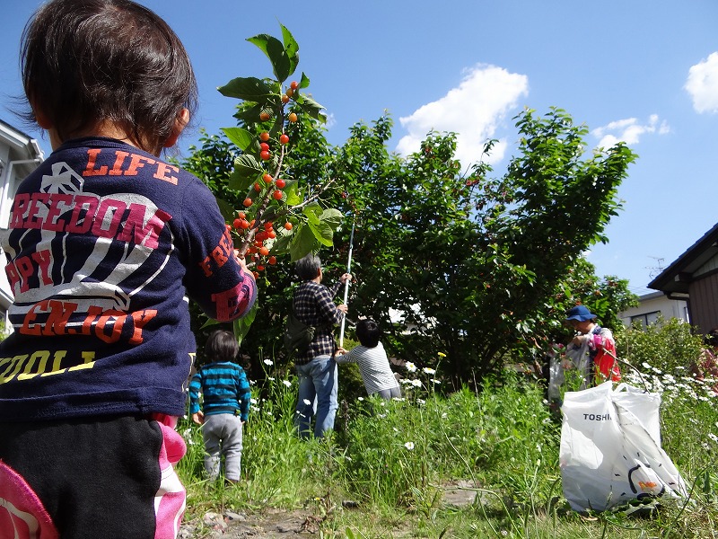 友達の庭に咲くサクランボ取りに参加です。