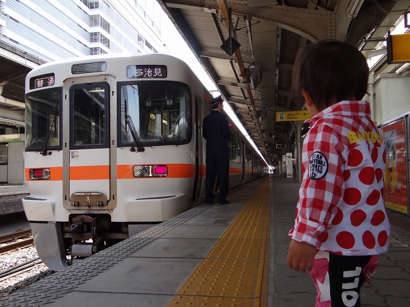 名古屋駅に来たので当然、チビ達に電車を見せにホームまで行きました。ところが今回は乗りたい!と言うので、