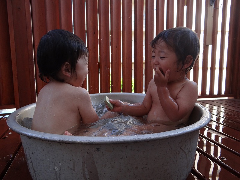 帰宅したらチビ達が楽しく水遊びしておりました。仲のいい兄弟です。