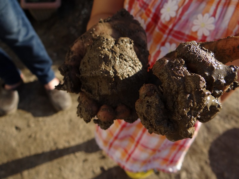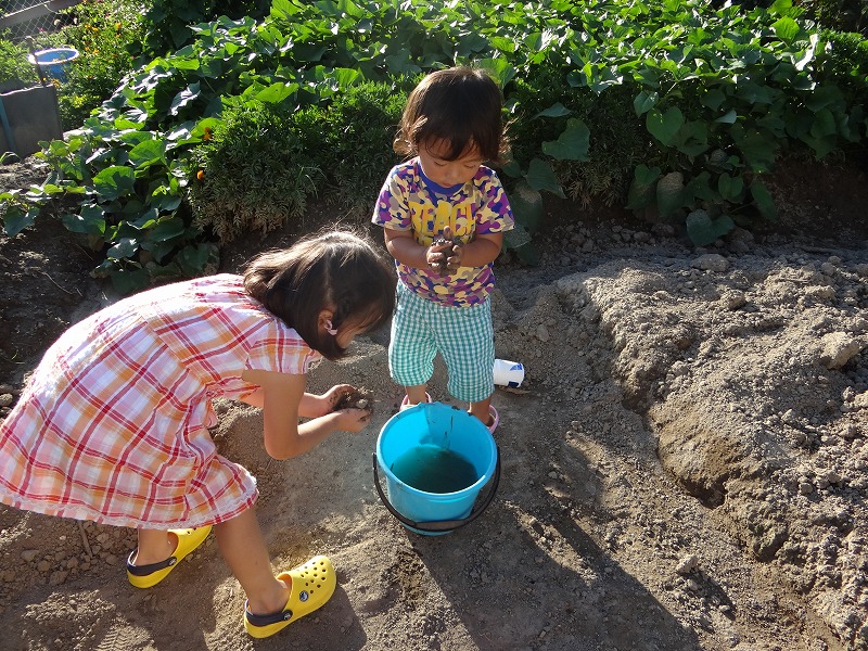 畑で遊んで、