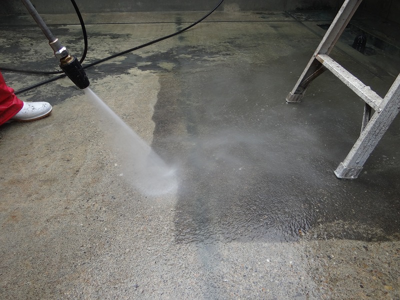 そんな感じで現場へ行くのも遅れましたが、今日から防水工事を始めました。まずは高圧洗浄を行います。