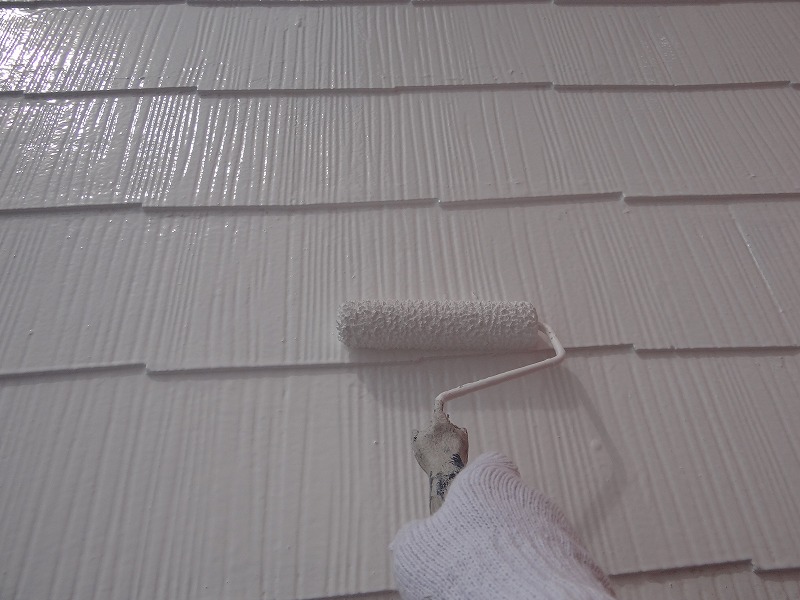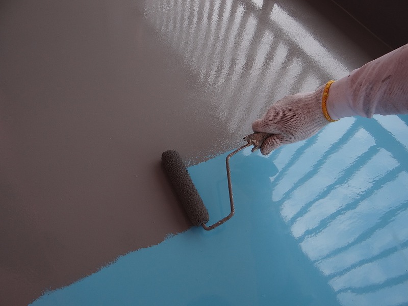 その後は防水工事の現場にて、仕上げのトップコート塗布、