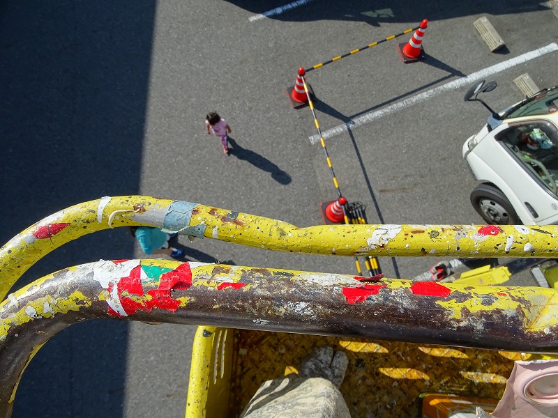 今日は高所作業車に乗って看板の鉄骨塗装工事を進めておりました。