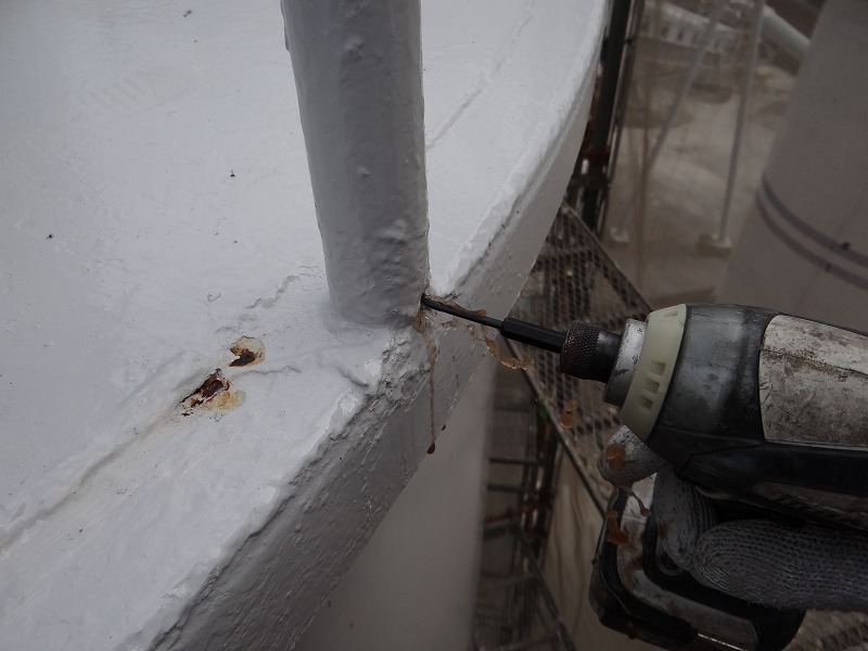 ちょっと水がにじむので、手摺の根元に穴開けて、予想通り。