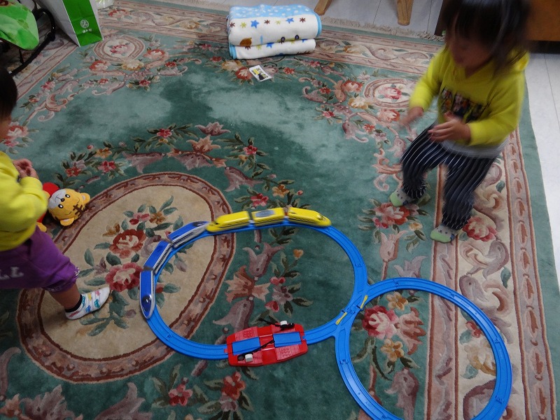 予想以上に喜んで遊んでくれています。ただ、車両の取り合いにならないよう2台走らせていますが、入門用のレールでは狭すぎてクラッシュの連続。またレールの増設ね。
