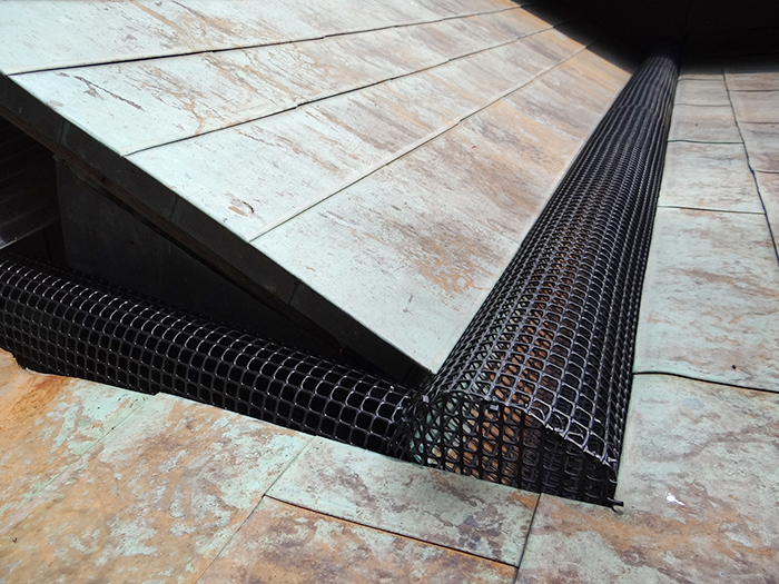 02.樋に堆積する落ち葉を防ぐ為に硬樹脂ネットの設置施工中になります
